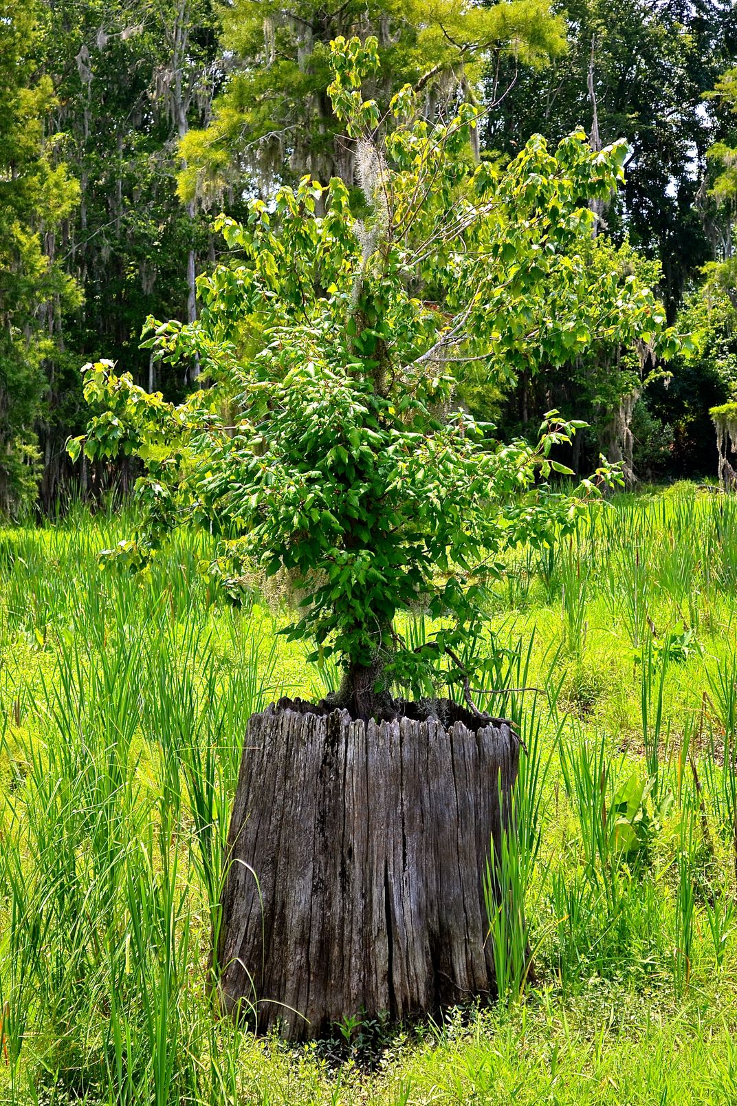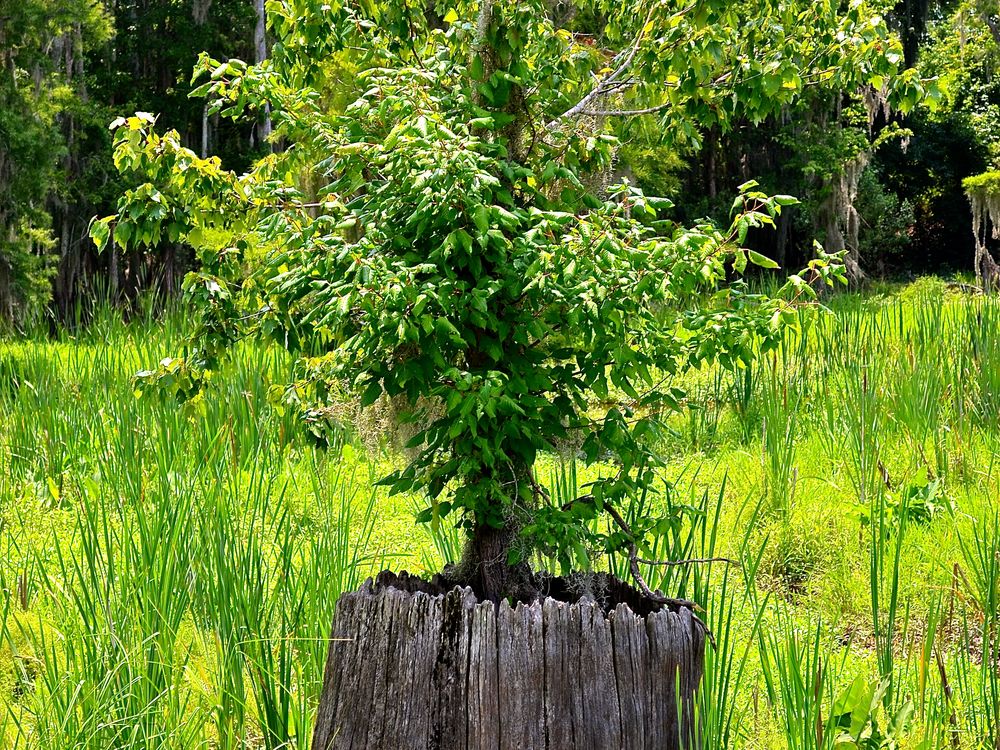I really like this photo. It shows that even though this large tree had died and left behind only a stump, another tree was determined to continue where it left off. It chose this stump, and nowhere else, to begin it's life.