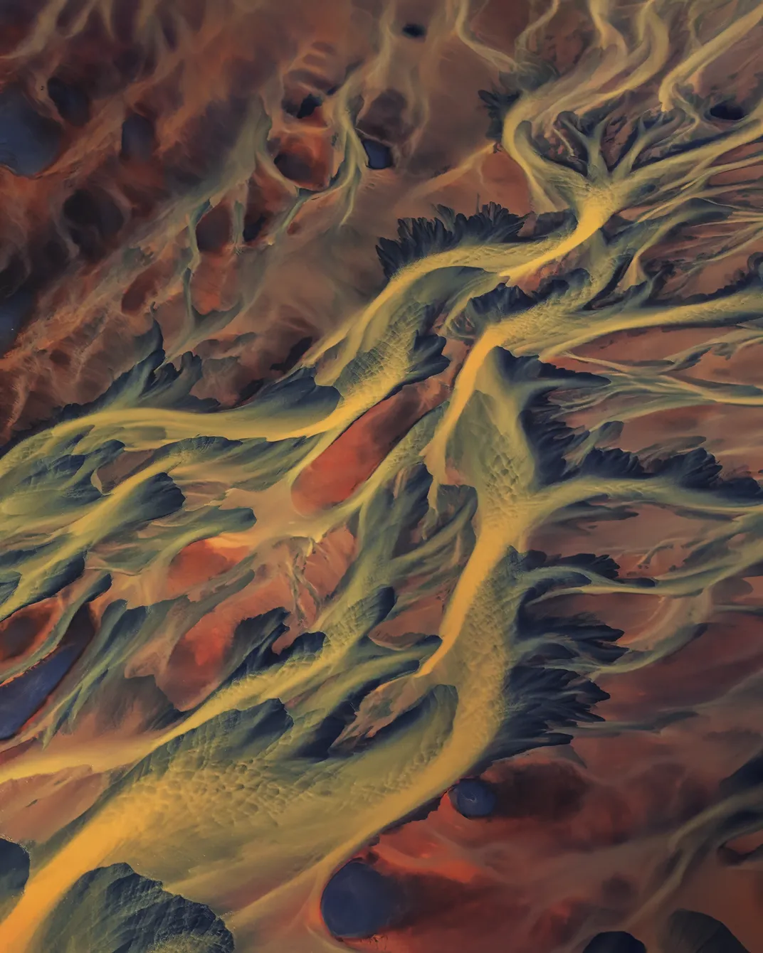 Aerial drone capture of the incredible rivers of Iceland. of glacier rivers winding through the land, this image captures the intricate patterns that mirror the human circulatory system. The vibrant streams flow like vital arteries, emphasizing the deep connection between nature’s rhythms and life itself. Each branching river tells a story of movement, renewal, and the enduring pulse of the Earth.