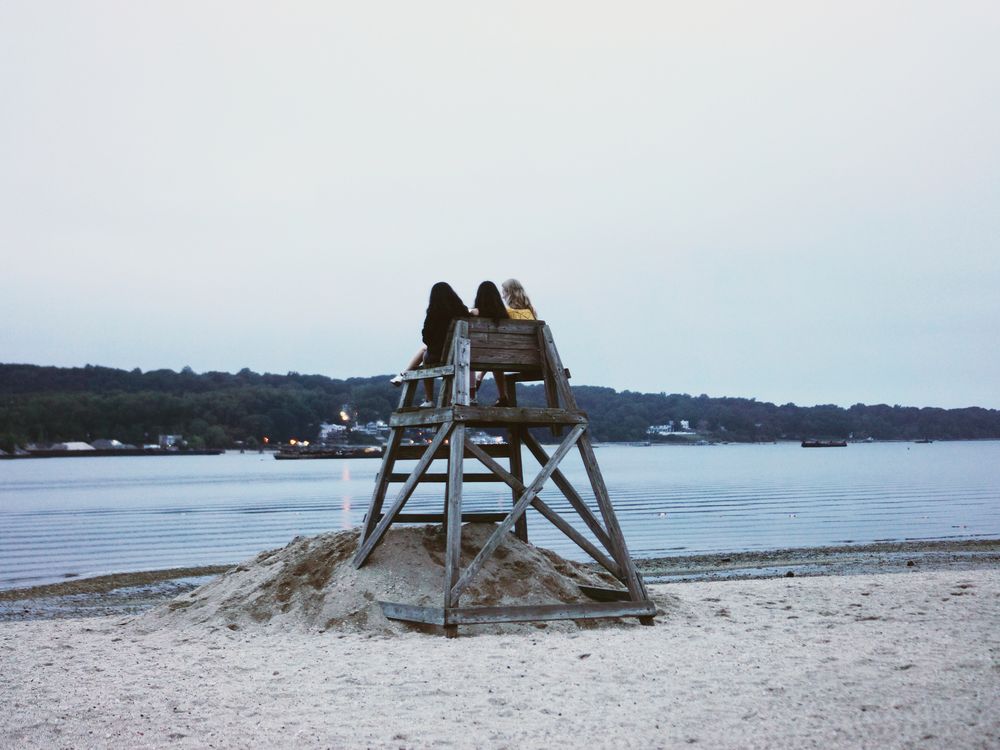 Three teenagers hang out on top of a lifeguard chair at an empty beach at twilight.