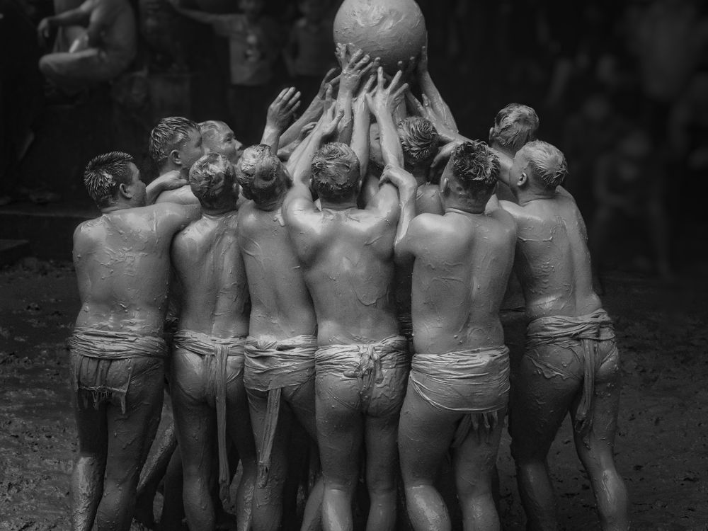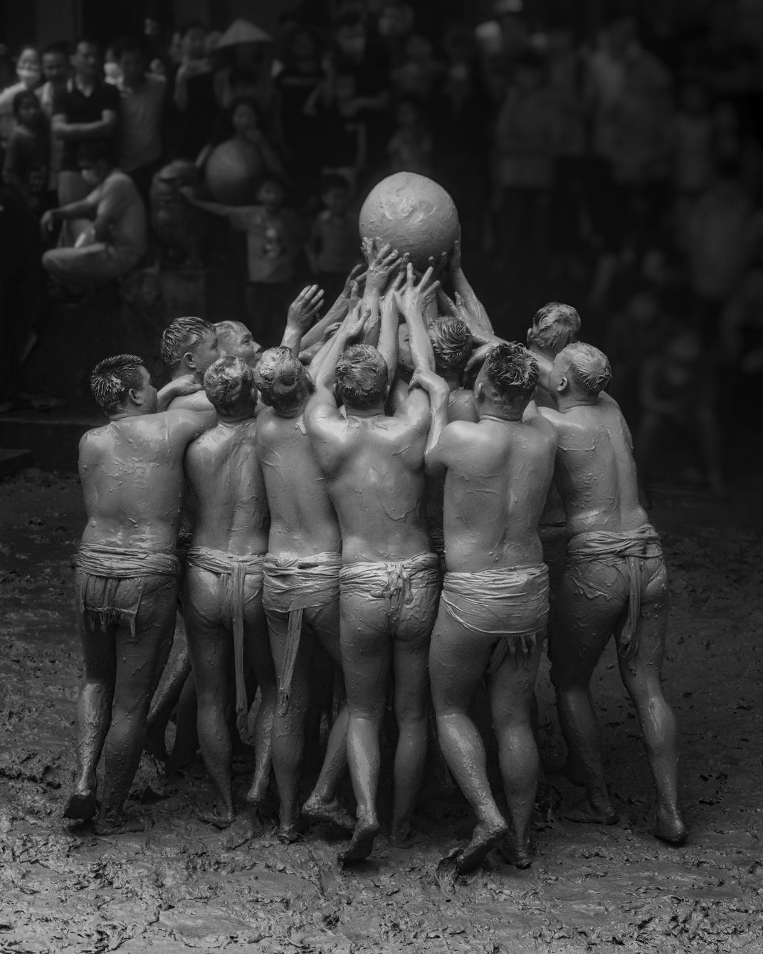 This is a sport of the ancients in Vietnam, held every 4 years, two teams compete in ball. It's in the mud wrestling festival, people here pray for favorable rain and wind.