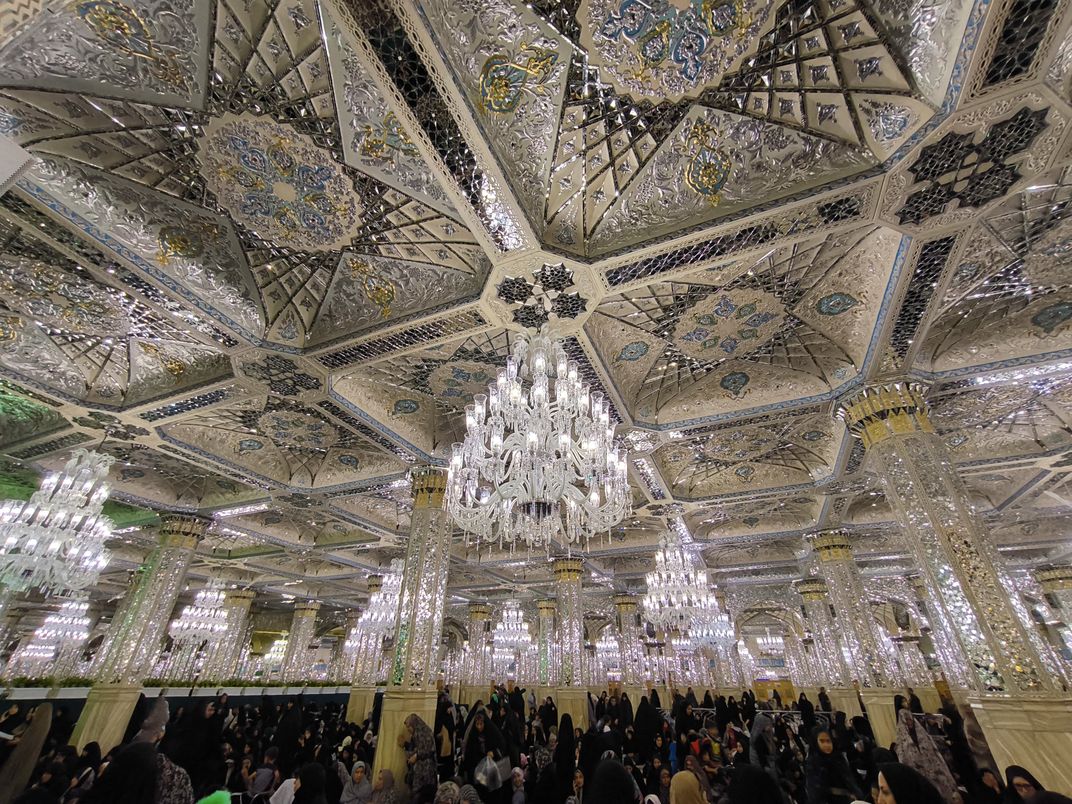 This photo is of the mirrored courtyard of the holy shrine of Imam Reza, the eighth Imam of the Muslims, in the city of Mashhad, Iran. This large and luminous hall was built by master mirror artists and architects of Iran.