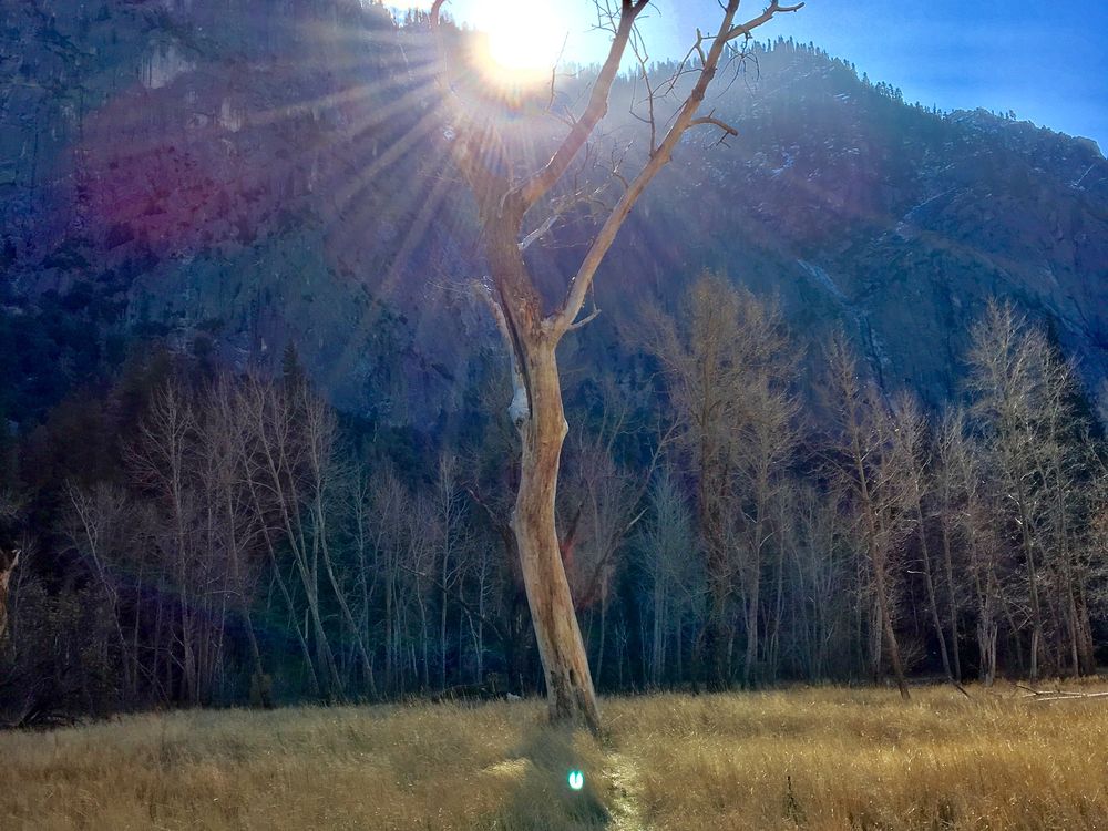 Hiking through Yosemite valley. Spotted a barren tree in the middle of the field. The sun was shining right through almost like it was trying to revive it.