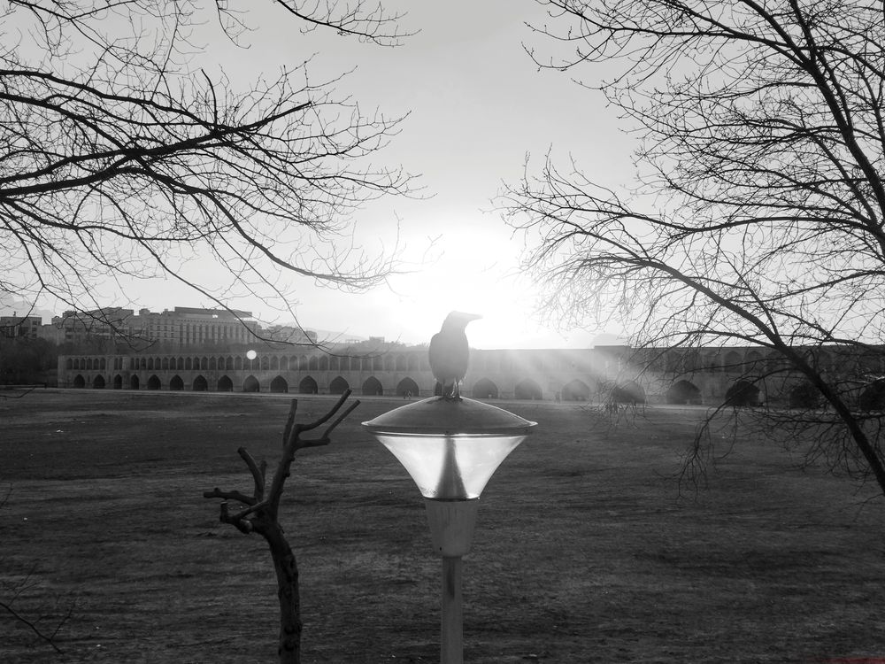 A solitary crow rests atop a lamp, facing the sinking sun that sets behind the ancient Si-o-se-pol Bridge. The dry riverbed stretches below — a stage where silence, history, and resilience meet. The contrast between the lifeless ground and the glowing horizon transforms the scene into a meditation on endurance and transience. The bird becomes a bridge itself — between light and shadow, between what was and what remains