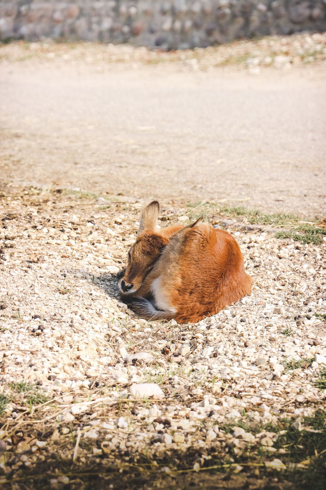 A young fawn sleeps curled up on itself, with its legs tucked away and its heart-shaped little face in full view.