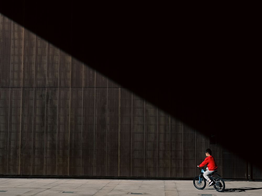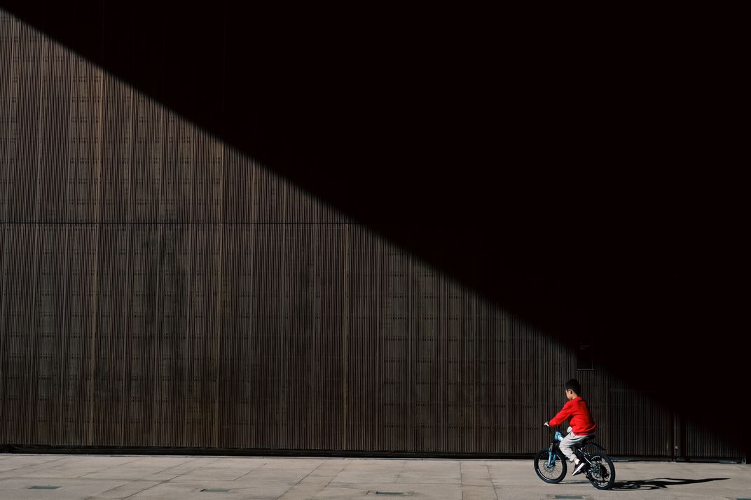 The photo was taken at the Mandarin Oriental Hotel in Shenzhen. It was a sunny afternoon, and as I walked in, I was immediately drawn to the large, slanted line of light and shadow. How beautiful the composition was, and how great it would be if the main subject were included. I waited a long time without seeing the main subject. An hour later, a father and son came in, and I saw the little boy in the red shirt riding his bicycle inside. I knew he was the main subject. At first, he didn’t step into the area of light and shadow either. After another ten minutes, he finally did, and that’s the photo you see. I believed in waiting, and I thought the main will come and be arranged by the god of photo