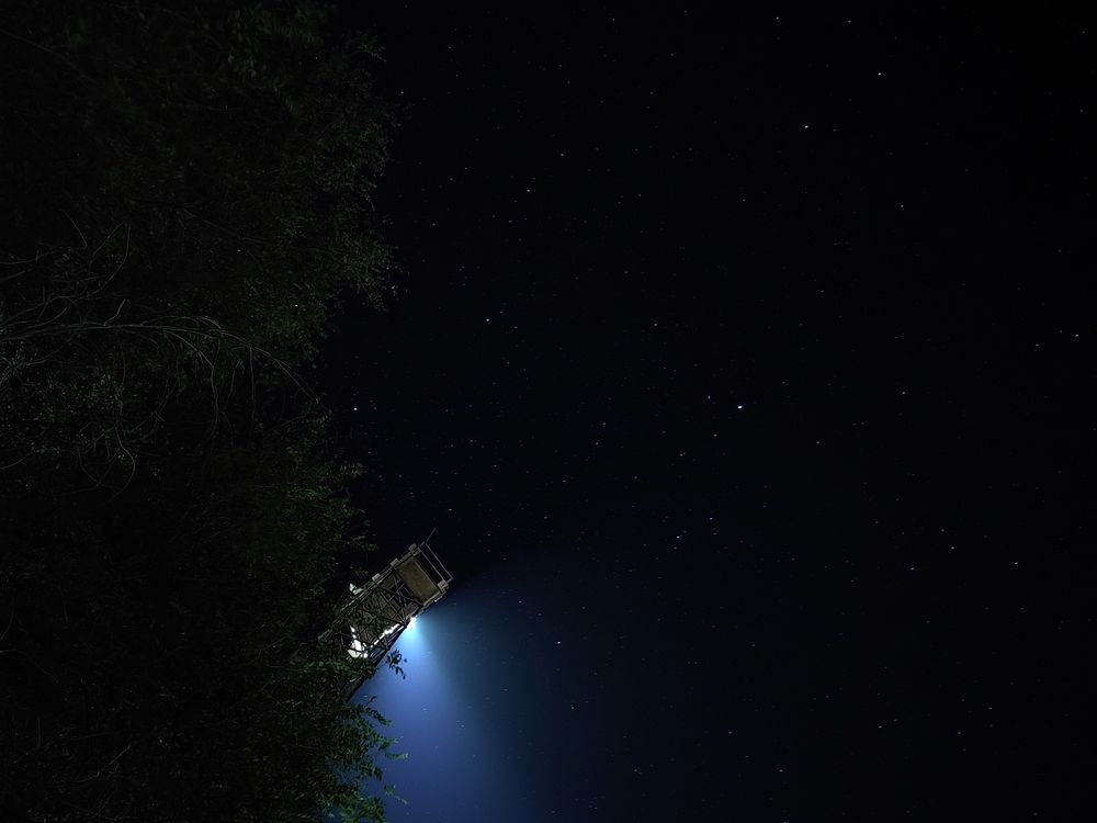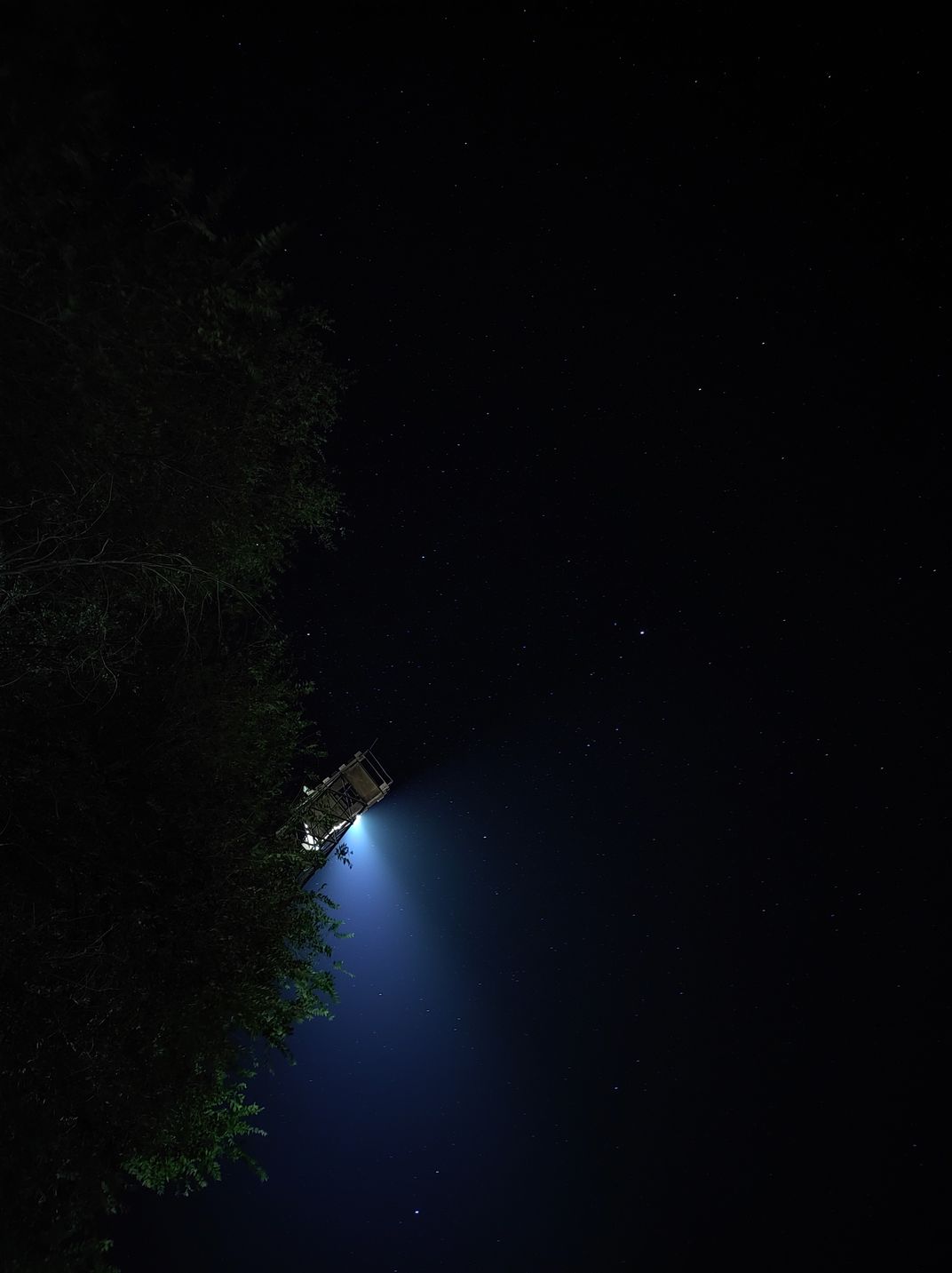 Lonely tree, stars aglow, bathed in the distant station's soft light during a train journey.
