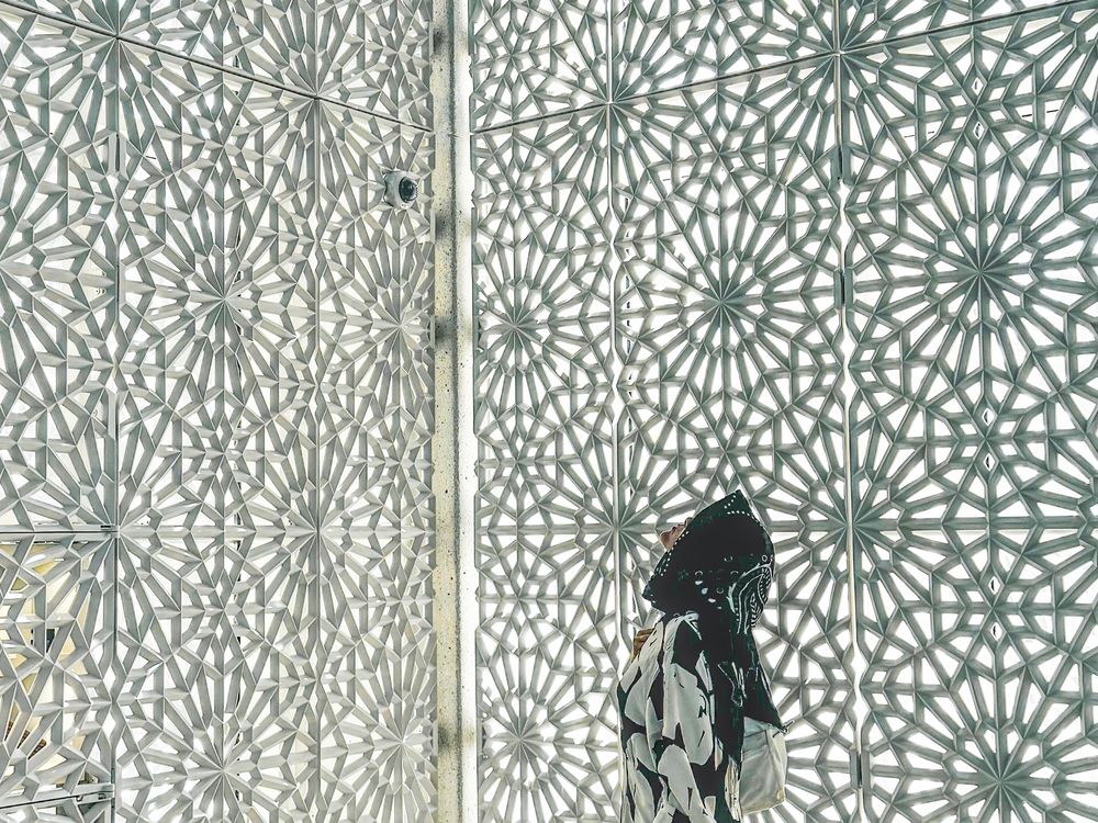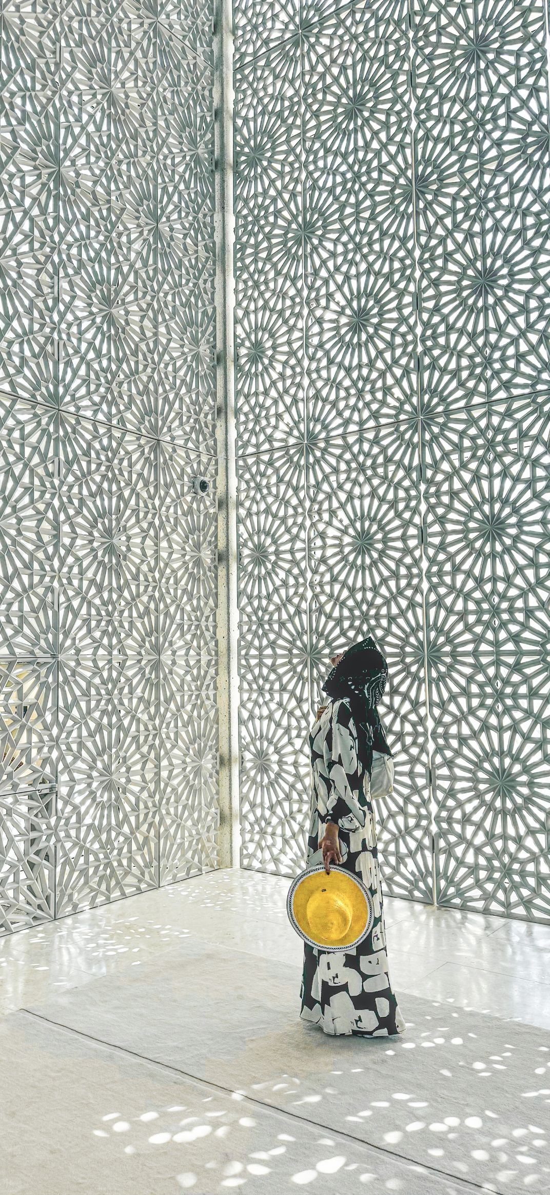 This photo was taken inside the Abrahamic Family House in Abu Dhabi, a unique interfaith complex that brings together a mosque, a church, and a synagogue in one shared space. The intricate geometric screens cast patterned light across the room, creating a calm, contemplative atmosphere. The person in the frame stands quietly in the glow, emphasizing the harmony and serenity the architecture is designed to evoke.