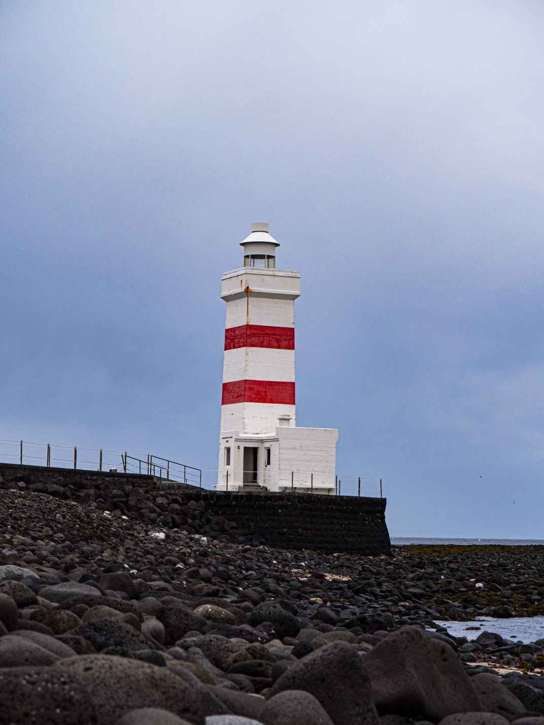 A red and white lighthouse by the ocean with dark rocks in foreground