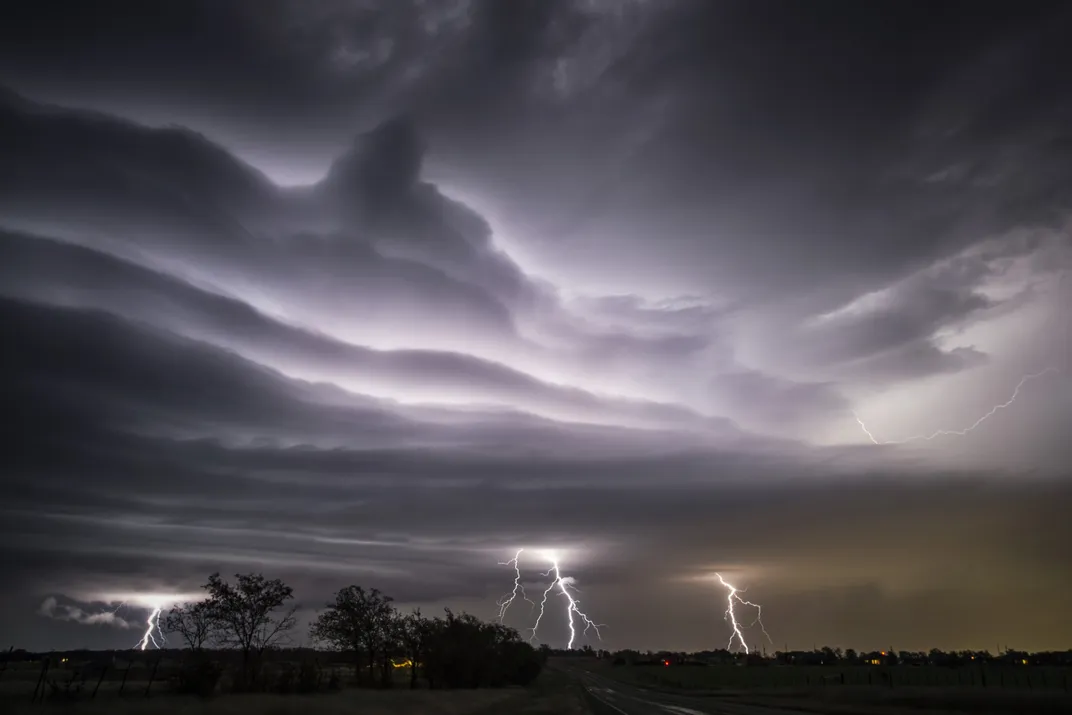 Lightning illuminates a shelf cloud in Saledo, Texas.