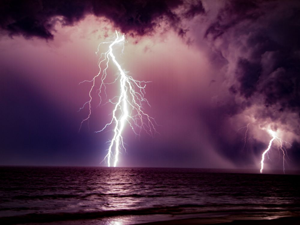 Two lightning bolts disappear into the Atlantic Ocean off Kitty Hawk, NC during a violent summer thunderstorm.