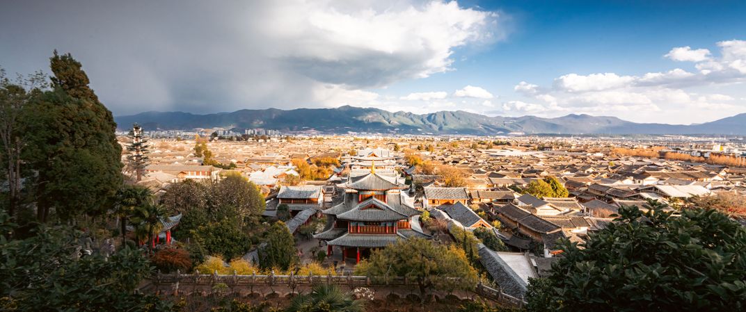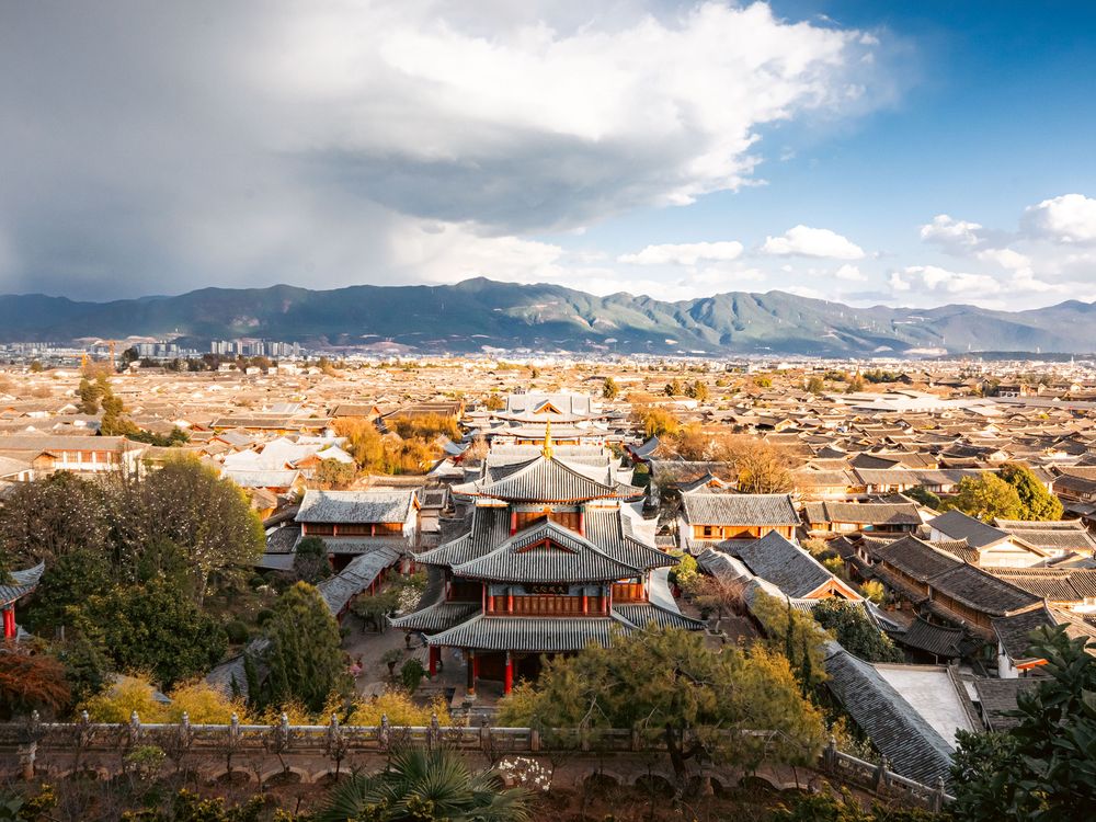 From the Wanjuan Tower of the Mu Residence, the rooftops of Lijiang Old Town spread toward the distant mountains. Sunlight breaks through rain clouds, picking out courtyards and halls in shifting patches of gold.