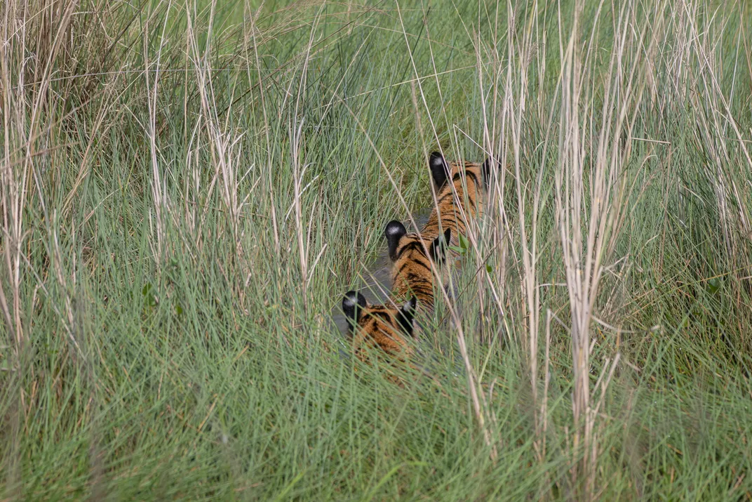 These 3 cubs were female and about two years old, they had started straying away from their mother but generally stayed close to each other. Here they are seen wading through the water accumulated from the monsson season gone by, towards the lake