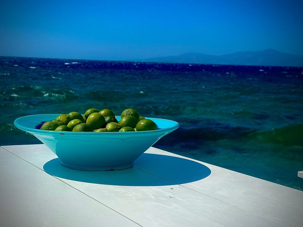 A bowl of fresh green limes rests on a sun-washed table as the Aegean Sea churns behind it. The photograph blends stillness with motion — the calm bowl against the restless, wind-shaped waves.