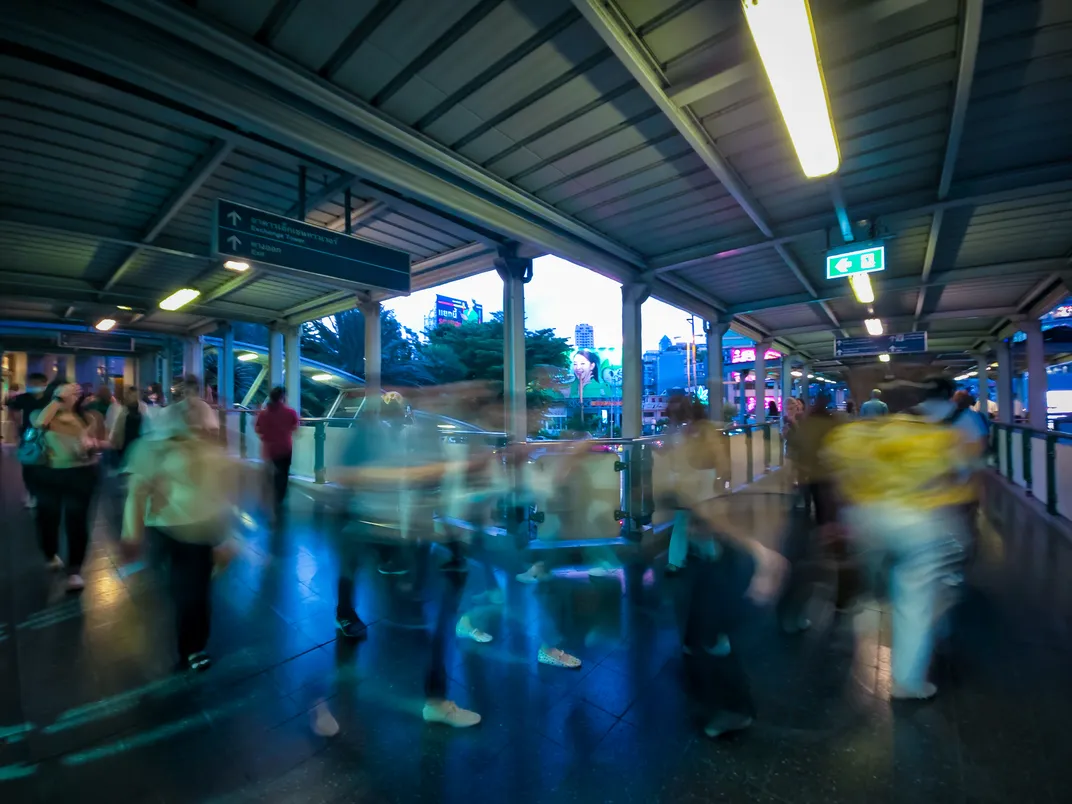 On the pedestrian bridge near the Bangkok Light Rail Station, crowds are surging. I took this slow door photo and increased the saturation to create a dreamlike atmosphere