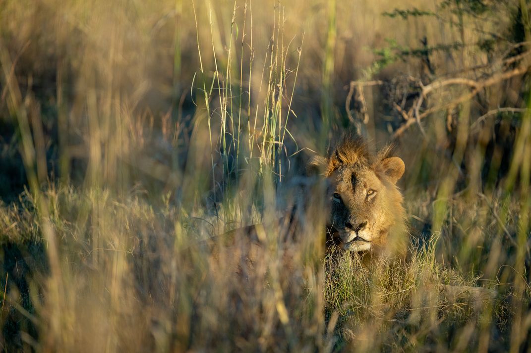 A lion found a spot to rest upon sunrise. We came across the lion on our last game drive in the Khwai Community Area in Botswana. Before it settled in this spot in the high grass, it walked directly alongside the open door jeep we were in. If you look closely, there are scratches on the lion's face, indicating a recent fight.