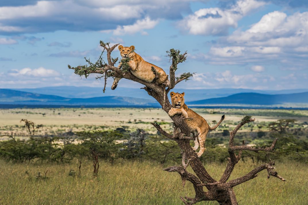This photograph taken at Masai Mara National Park. This photo shows the two African Lion seating on the tree.