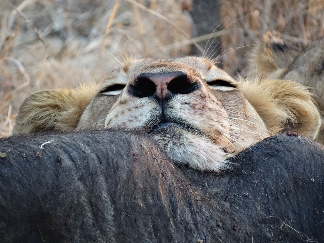 After killing a buffalo a large group of female lions and cubs systematically ate the animal. When they were full enough one of them rested whith her head on the back of the buffalo.