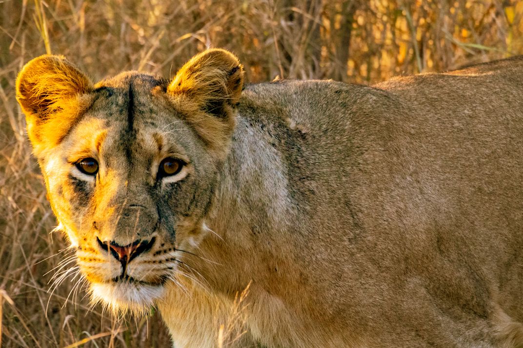 A lioness stalks a herd of impala. Kruger National Park, South Africa.