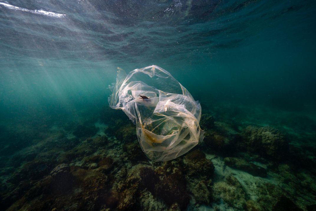 A small stone crab seemed sheltering inside an old plastic bag floating nearby the reefs of Nam Du island, located off the south coast of Kien Giang province, Vietnam.