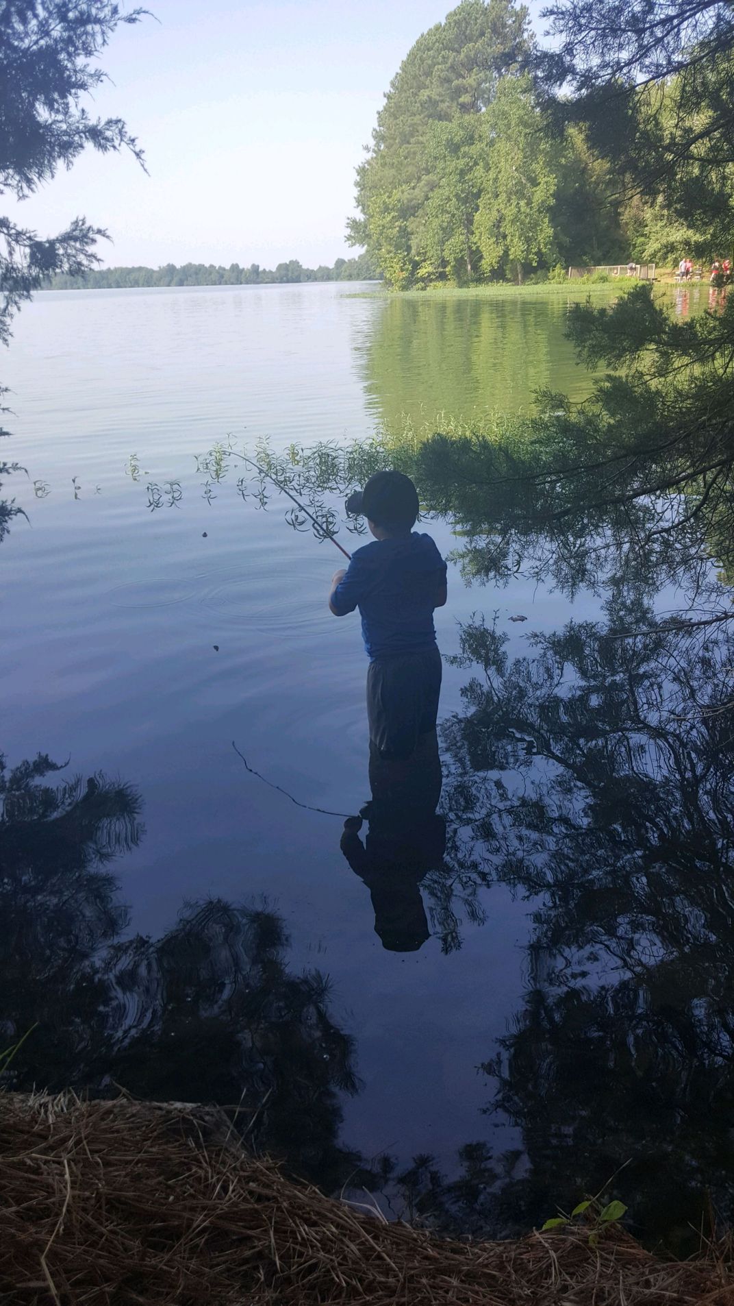Grandson and I were at a fishing rodeo for kids. He had to adventure out in the lake to catch the big one.