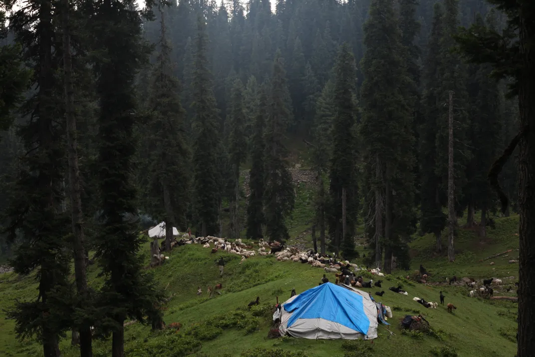 Nomad family who live in a makeshift tent during the seasonal migration on the hills of himalayas in Kashmir. They use to travel by foot along with cattle every year to these places.