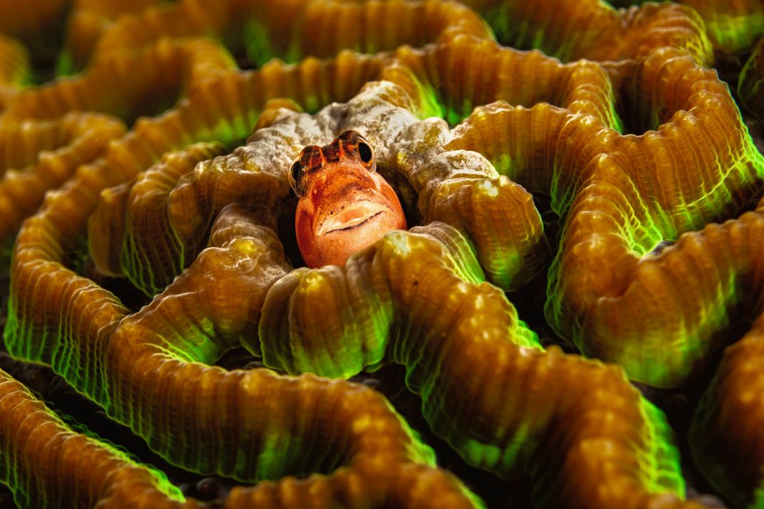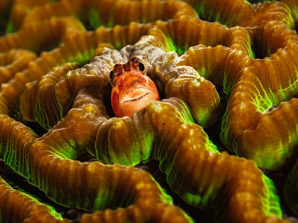 This little blenny fish has found a hole in a brain coral which apparently is now its home. When approaching slowly and with a little patience the little fellow is curious enough to peer out of his hole to check things out, but he can disappear lightning-fast if he thinks something is wrong.