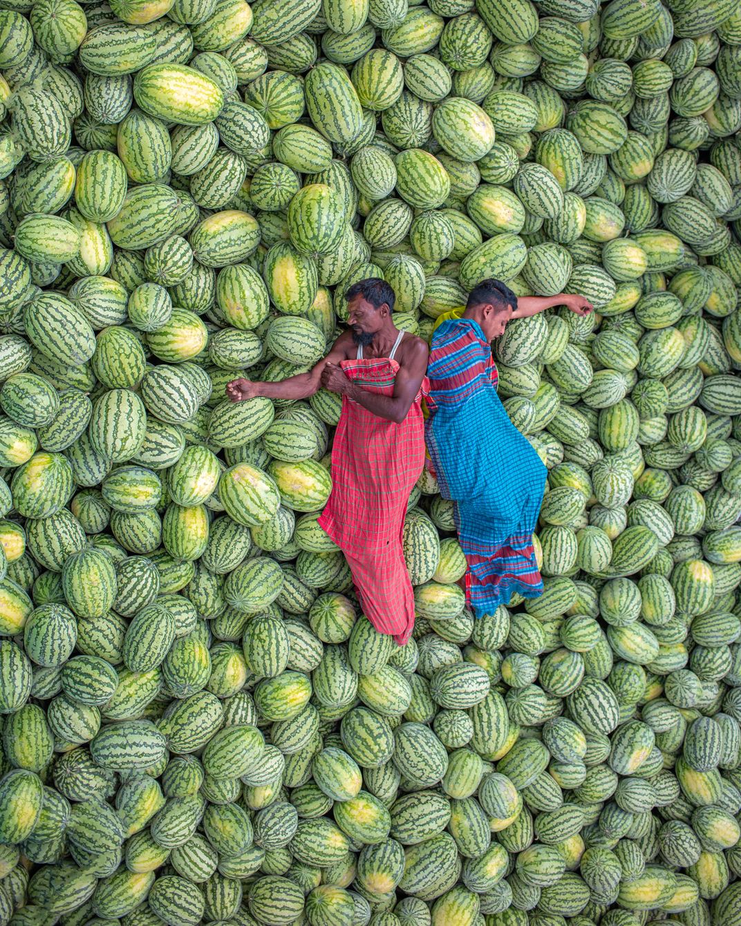 Two worker lies on a massive bed of watermelons while taking a break from unloading deliveries beside the Buriganga river near Dhaka in Bangladesh