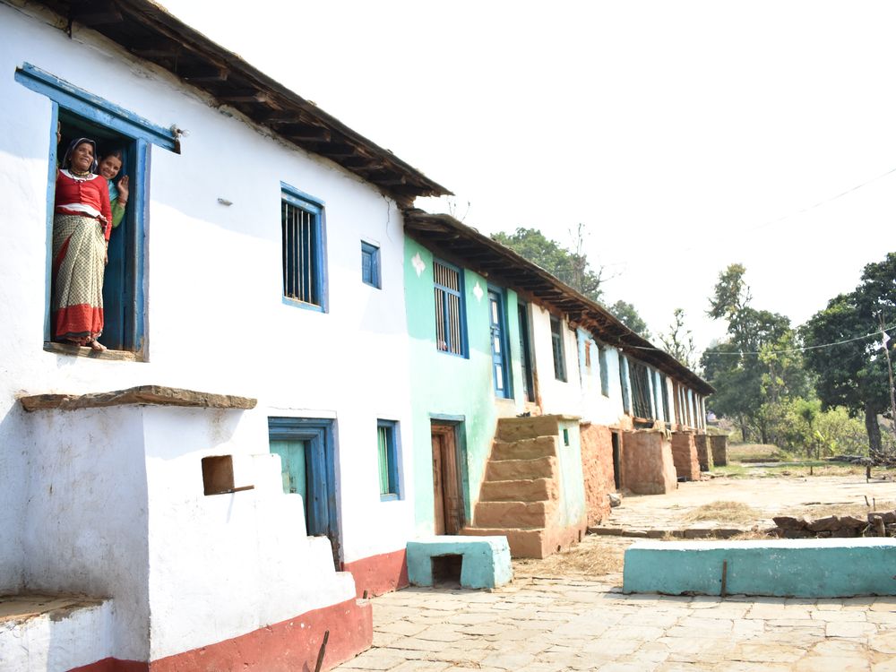 The photograph shows two women peeping out of their home in a bakhali (cluster of homes) in the traditional local community of Uttarakhand state.