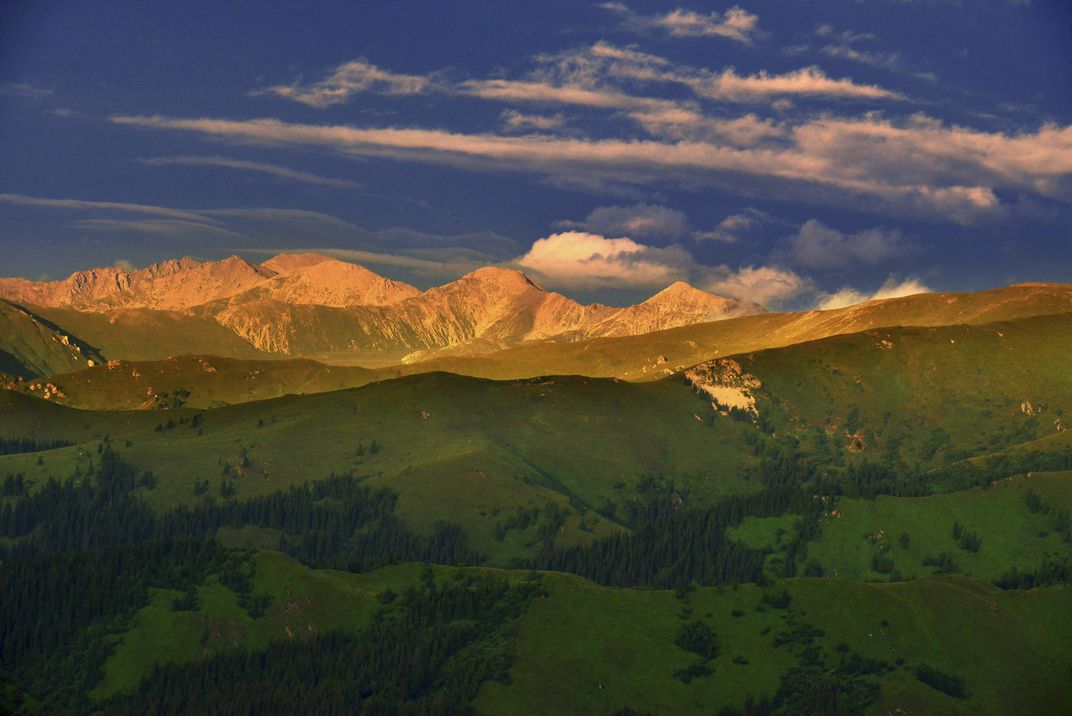 The mountain ranges here connect one after another, undulating and rolling, with distant peaks shimmering brightly under the sunlight.
