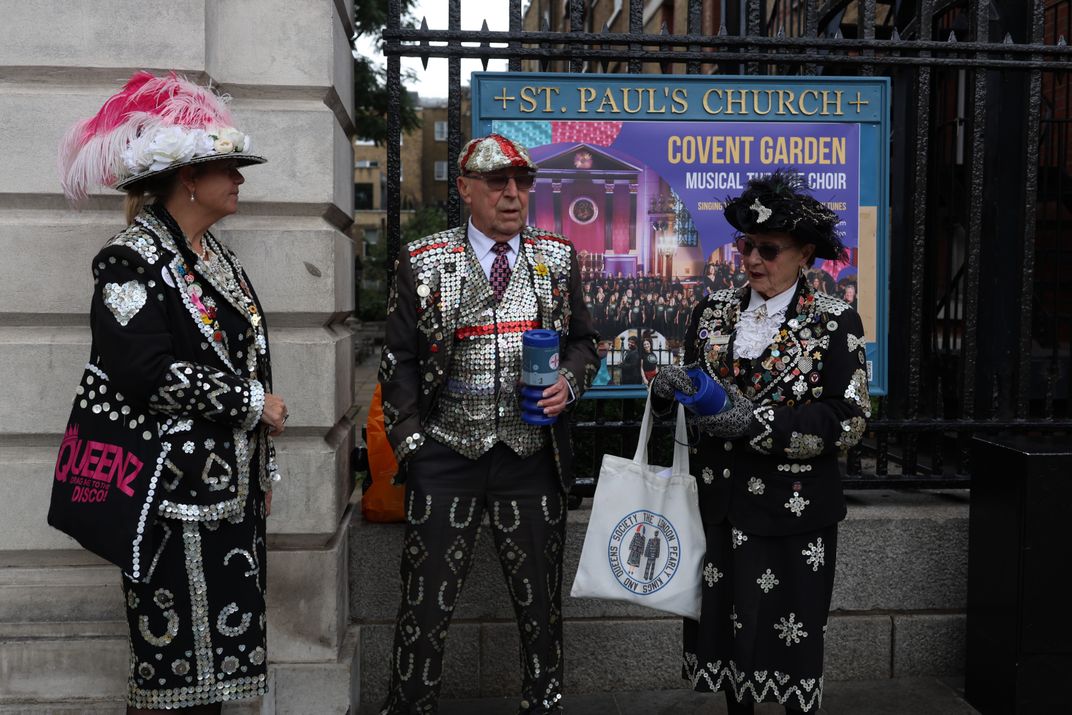 Three Londoners dressed in traditional pearly suits pause for a conversation outside St. Paul’s Church in Covent Garden. Their outfits, decorated with hundreds of shining buttons, celebrate a long-standing cultural tradition rooted in community and charity. This candid moment captures the warmth, character, and timeless charm of London’s street culture.