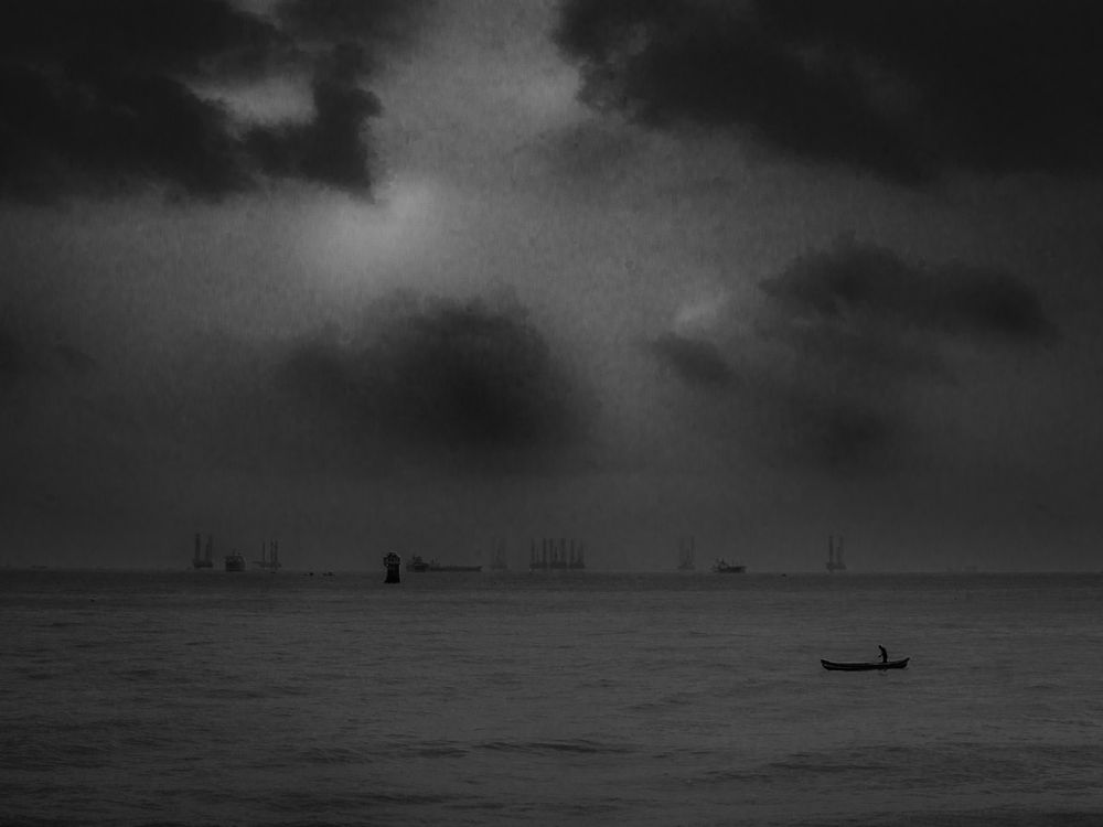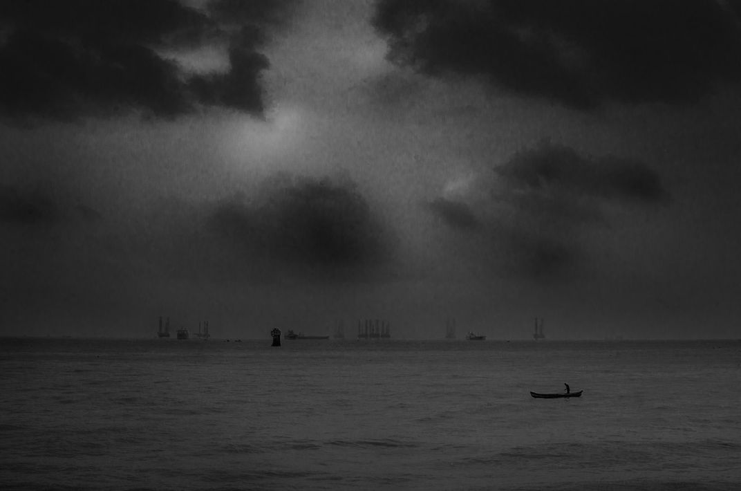 A solitary fisherman braves the choppy monsoon seas and brooding clouds to cast a net in the harbour area of Gateway of India. The towering rigs and vessels in the backdrop underline this puny character and his grit in facing the elements alone