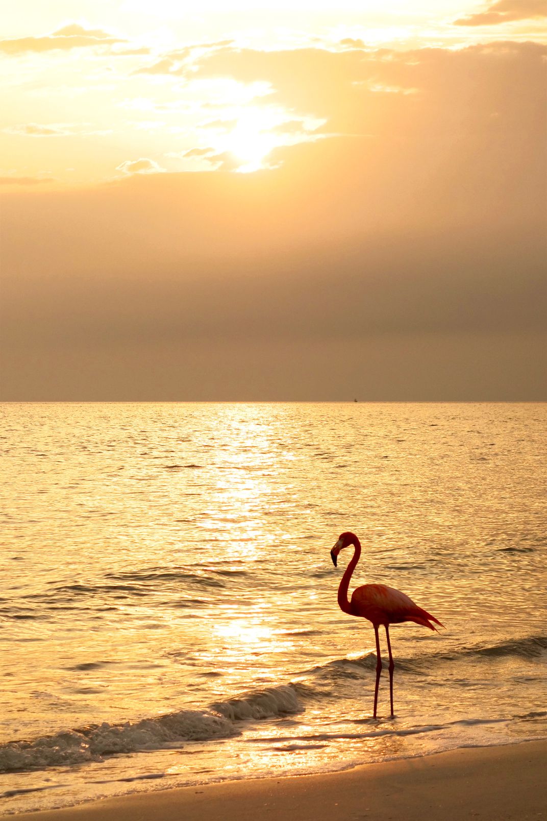 Lonely Red Flamingo watching a sunset over the Gulf of Mexico