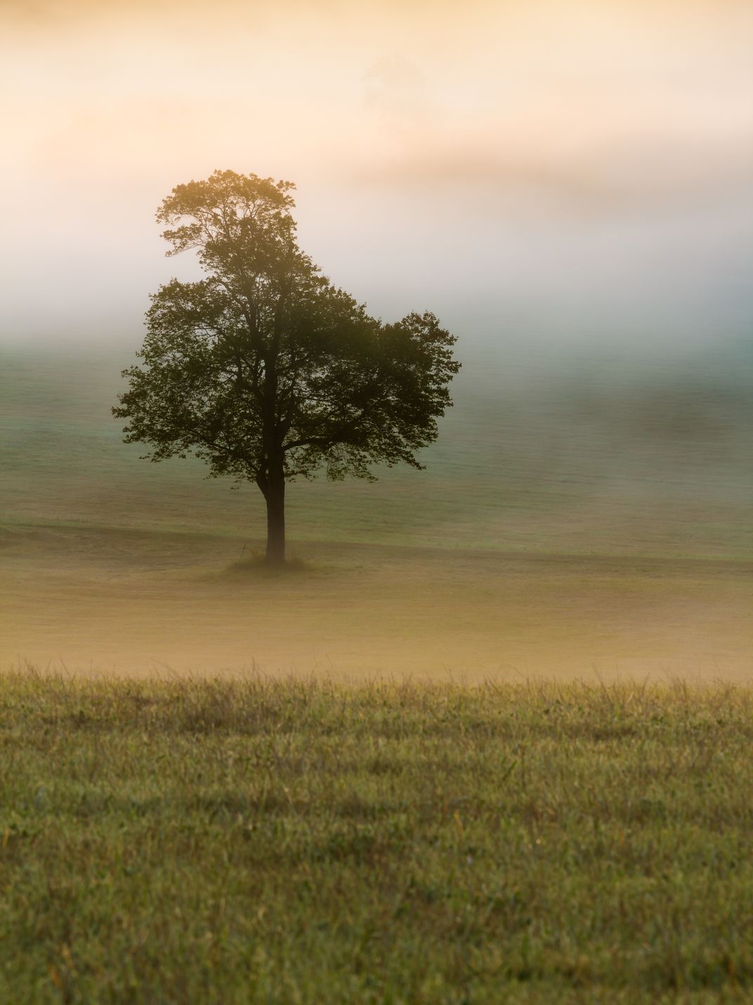 This photo was taken in Lancaster Massachusetts at the Dexter Drumlin Reservation. The tree is in the middle of agricultural fields that were filled with fog before the sun rose in the morning.
