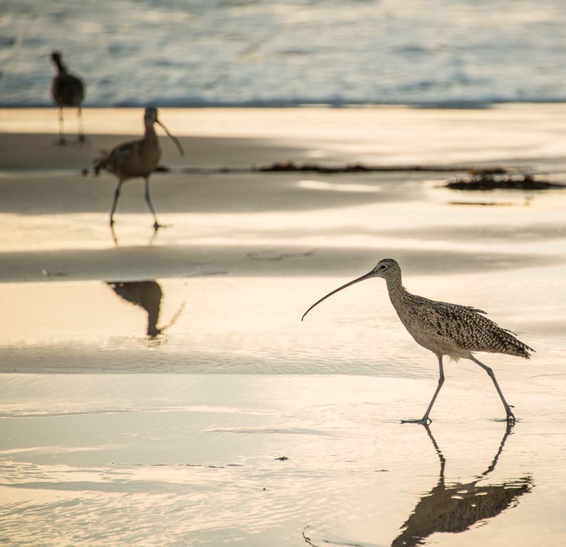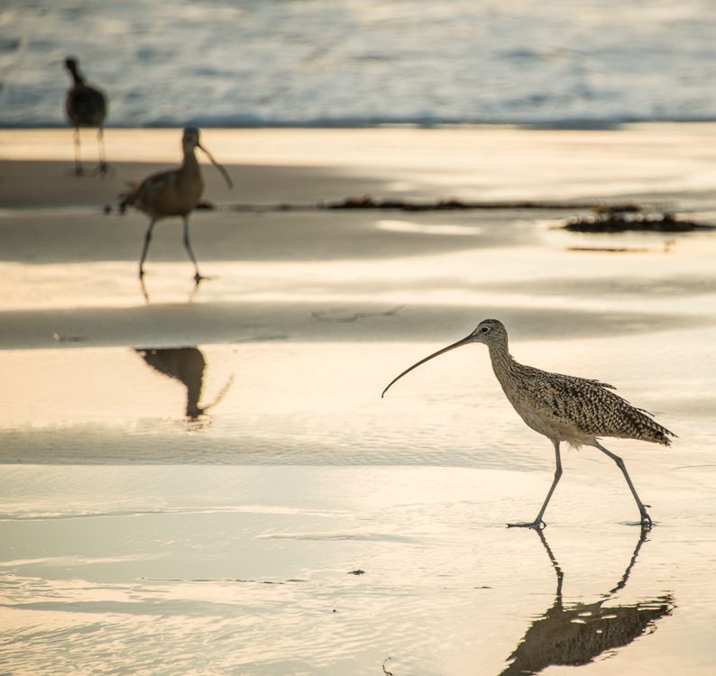 Long-billed curlews on the golden sunset beach at Morro Bay