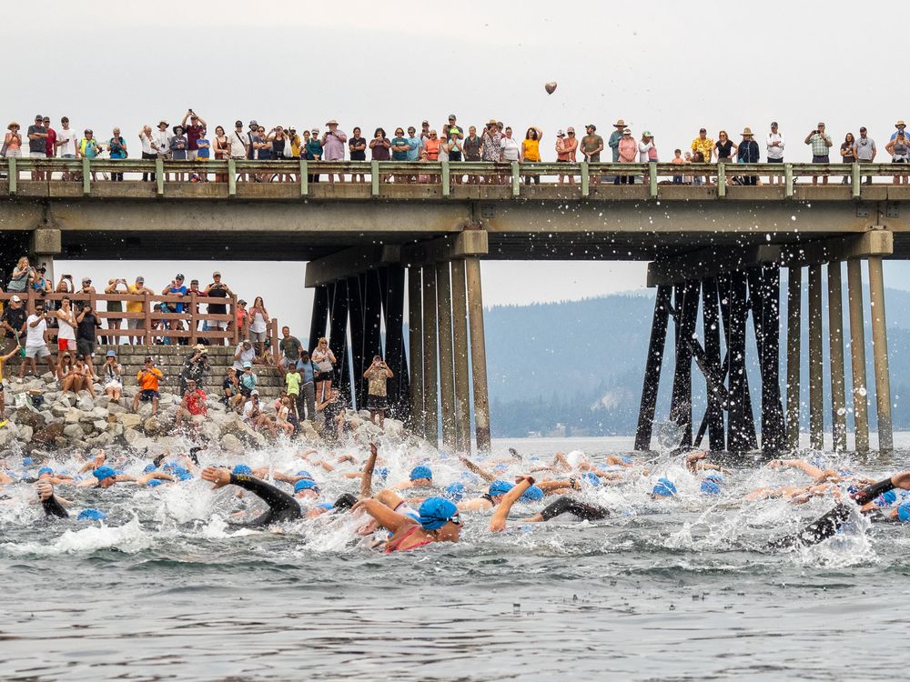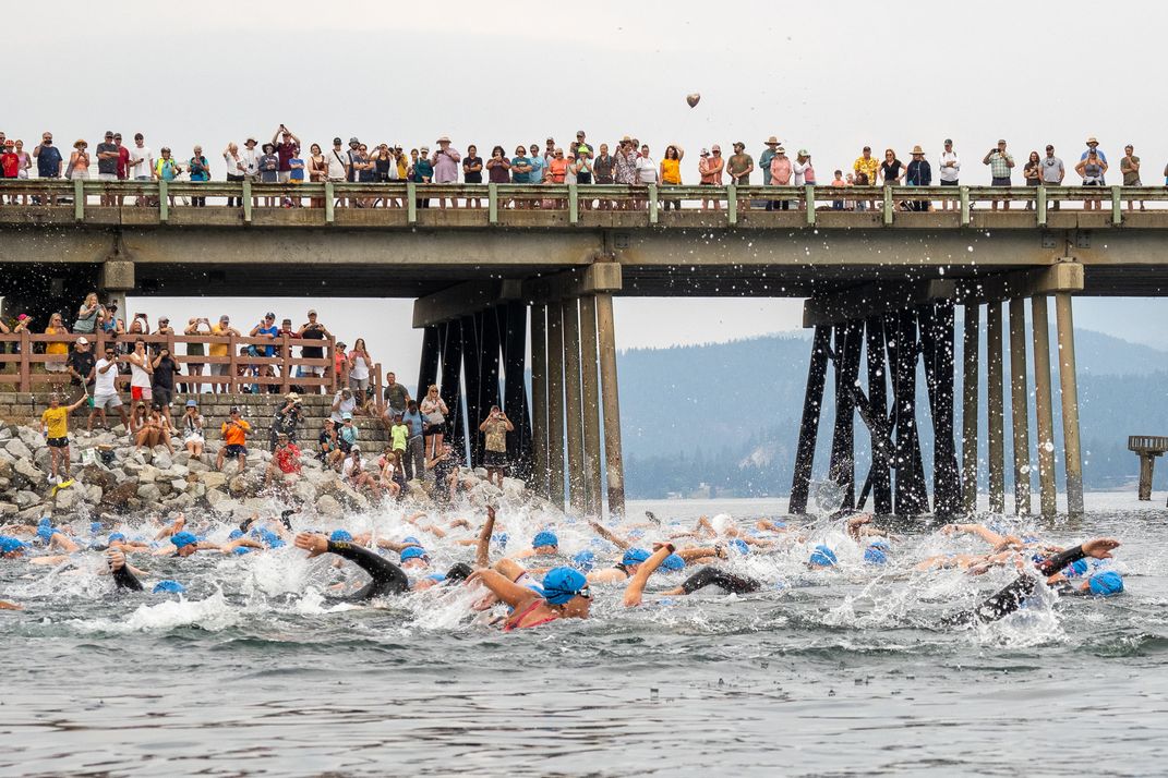 Every August, the folks in Sandpoint ID host a Long Bridge Swim. This event is a fundraiser for swim lesson iniative in town. The bridge runs across Lake Pend Orielle next the US Rt. 95 bridge. In 2024, there were 700 swimmers participating. Onlookers can stand on the bridge and walk along as the swimmers make their way 1.76 miles across. This photo was taken as the race began and the first swimmers were heading out.