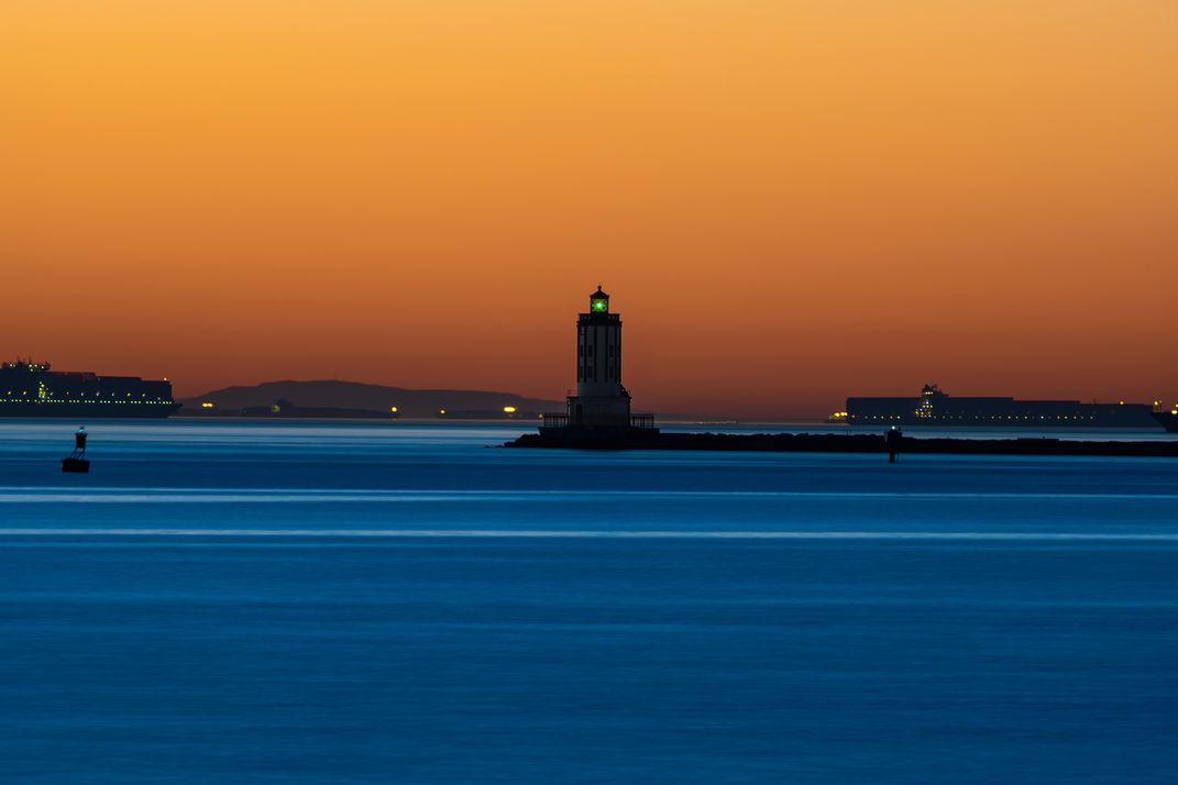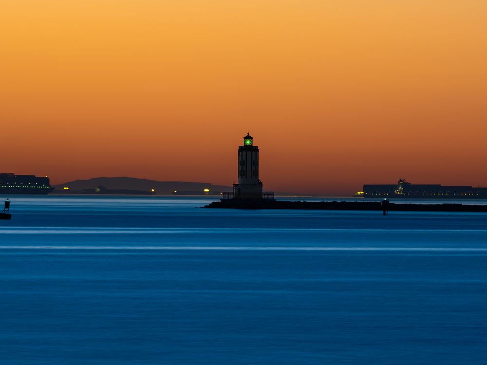 This is a long exposure of a Lighthouse in the Los Angeles harbor with Cargo Vessels in background.