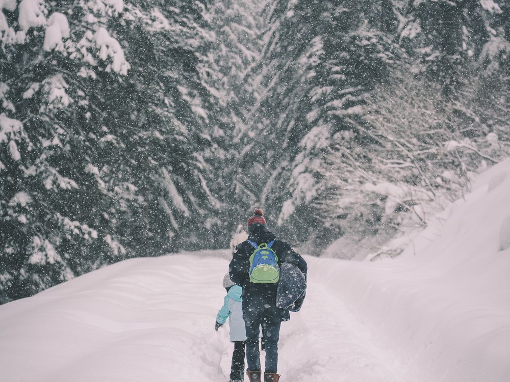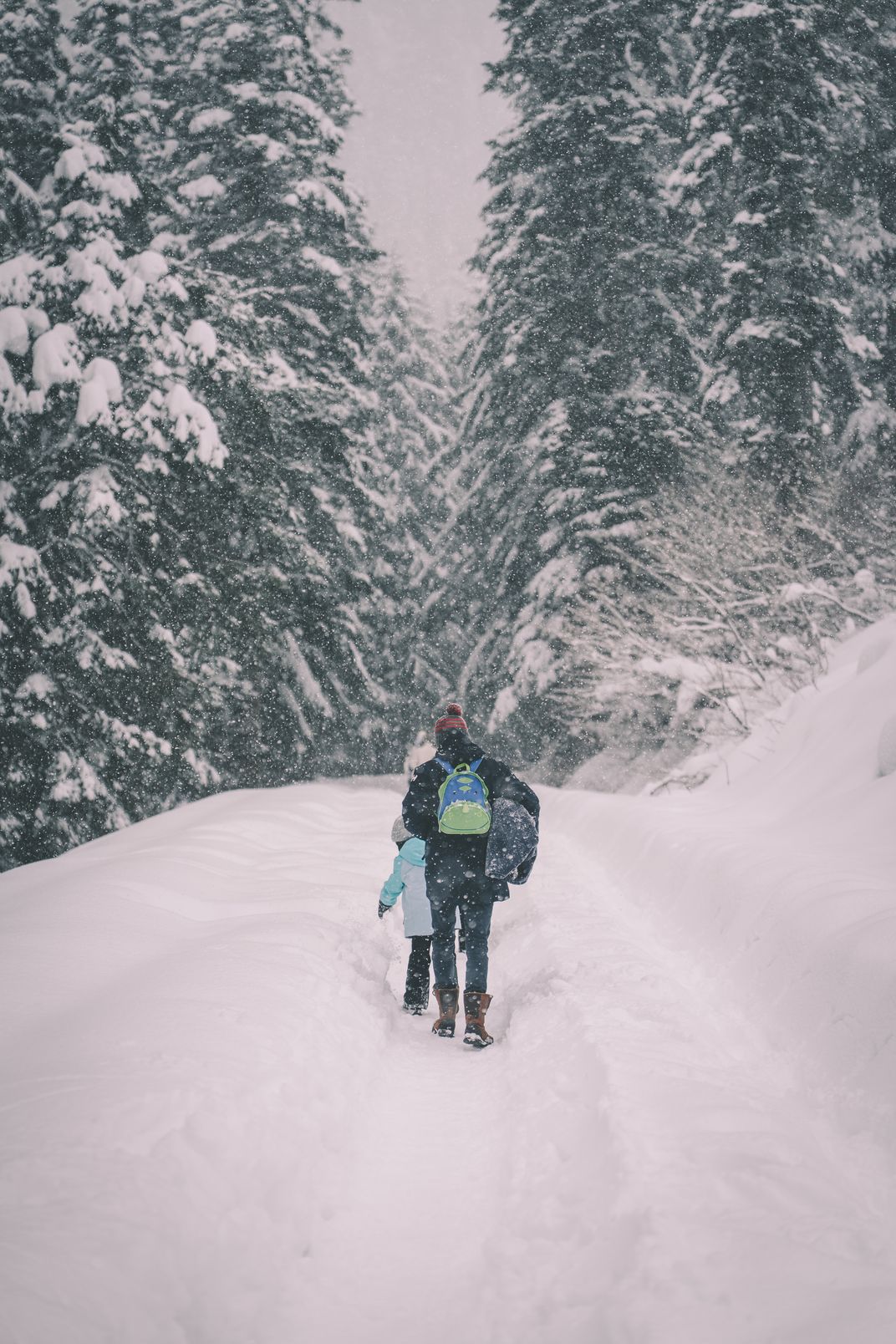 A parent and child trek through deep powder on the trail to Franklin Falls. Captured on Feb 16, 2025, amidst heavy snowfall, this moment highlights the quiet bond of family exploration in a winter wonderland.