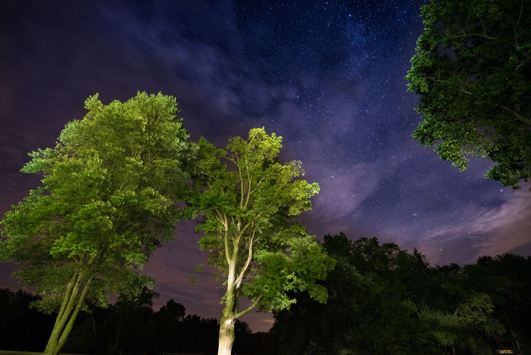 A sky partly cloudy and partly full of stars on a dark summer night at Turkey Run State Park.