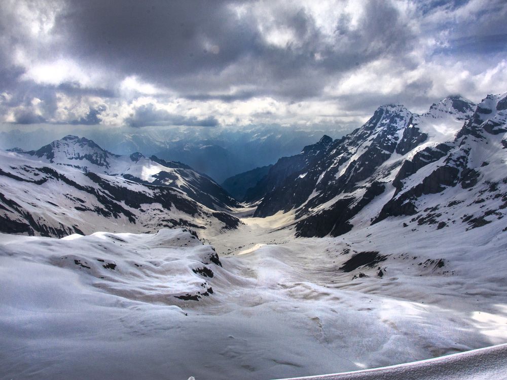 Looking back to the Jagat Sukh Valley while climbing on a wall ridge connecting Mt.Deo Tibba and Mt. Norbu Kang.