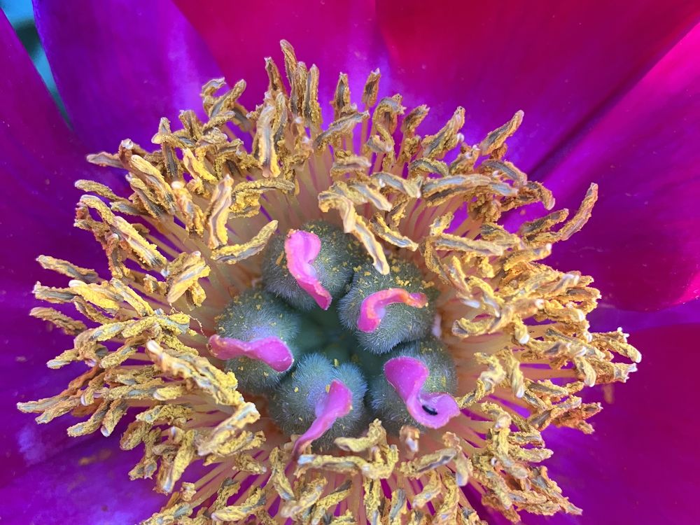 This is a close look at one of my peony stamens: a close-up view that changes it from a normal, ordinary garden flower to something much more fantastic and magical