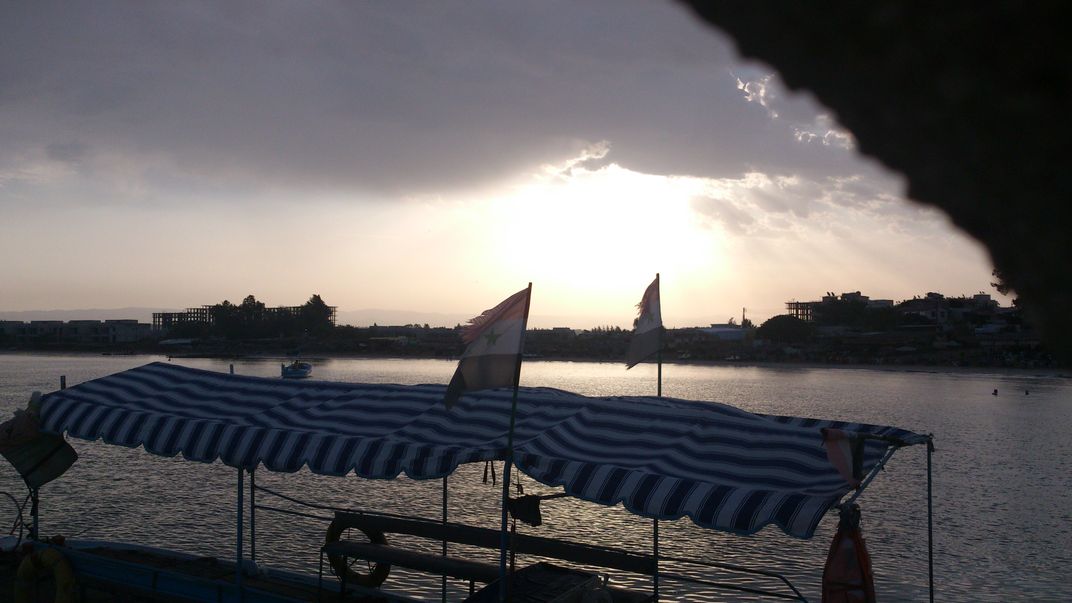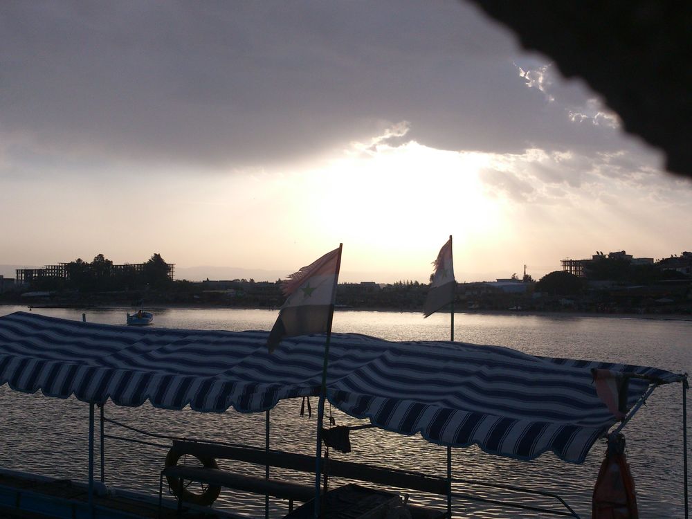 A trembling boat with torn flags, sailing with no purpose or aim between the sea waves, the sun light appears between the dark clouds.
