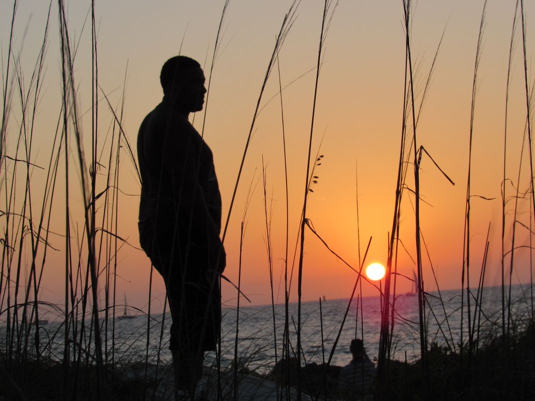 Silhouette of a man looking at the sunset.