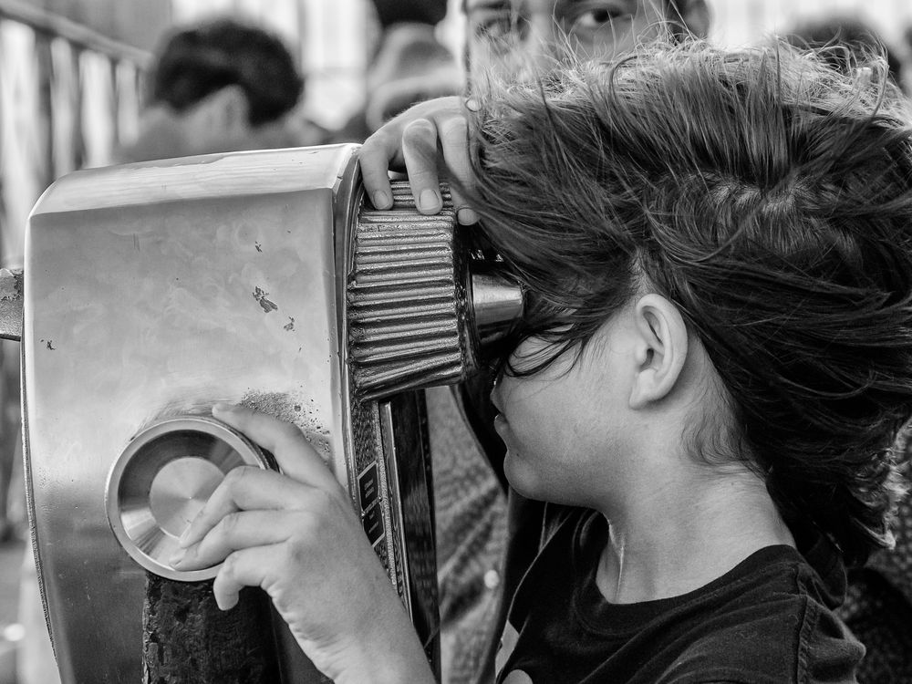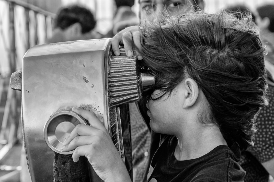 The observation deck at the Empire State Building was packed as sunset approached. This youngster was totally absorbed by the view of lower Manhattan through one of the Tower Viewers, while his father was keeping an eye on his sister. Tower Viewers or observation binoculars, have been a part of the American tourist experience since 1934.