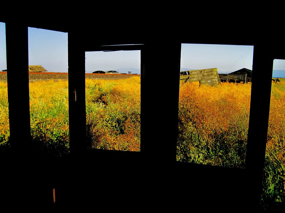 Looking out towards the railroad tracks, through the empty window panes of an abandoned cabin in the ghost town of Drawbridge, CA