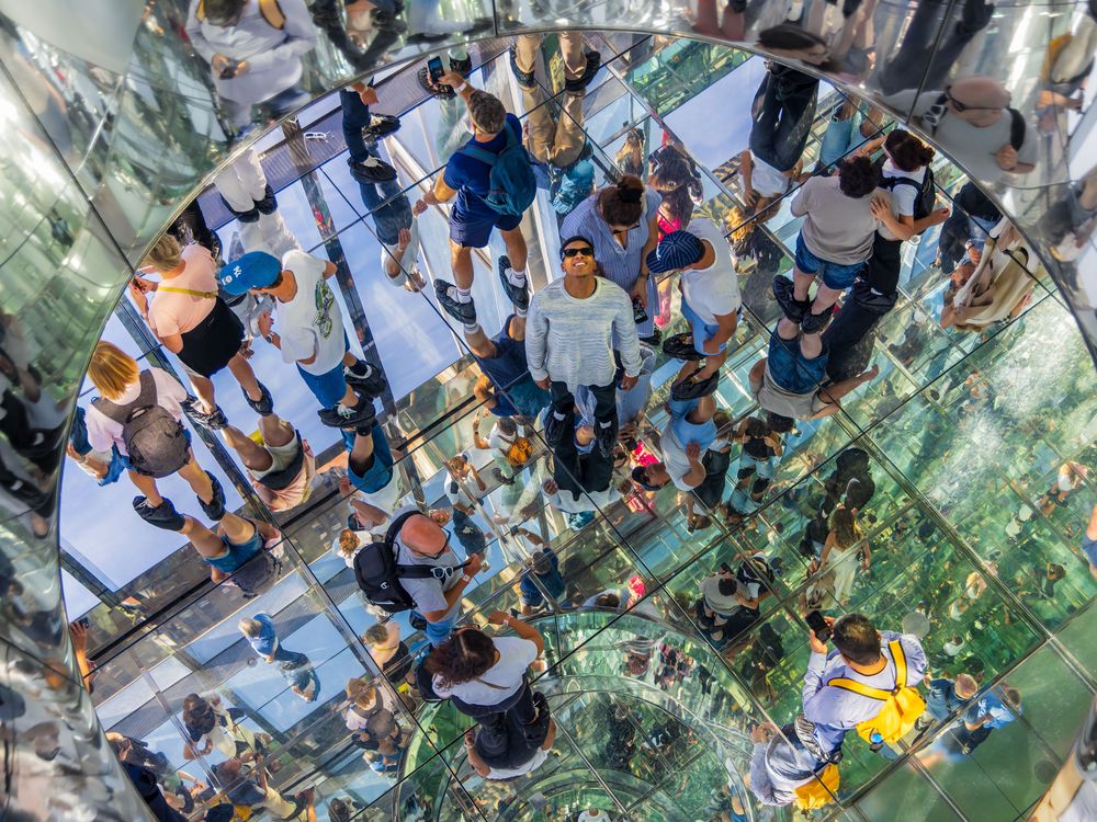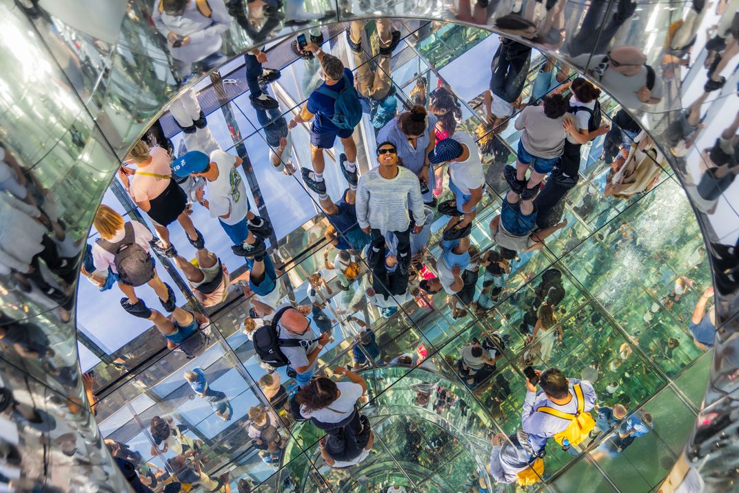 The Summit attraction at the new Vanderbilt One in Midtown Manhattan consists of 3 floors of windows and mirrors offering and reflecting views of Midtown. A circular tunnel of view that connects all three floors creates collaged moments of humanity, individually reacting to the same visual stimulus.