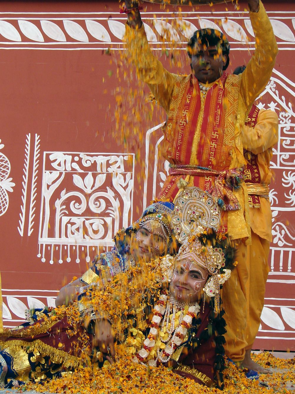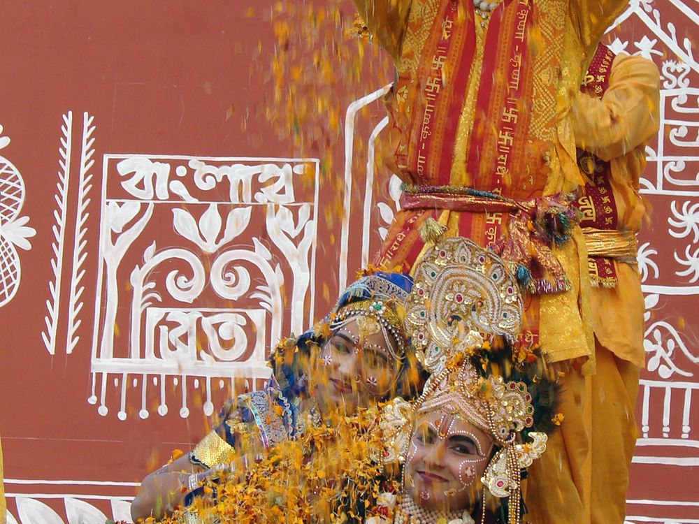 Lord Krishna and Radha, get a shower of marigold petals at Holi at Mathura, India.