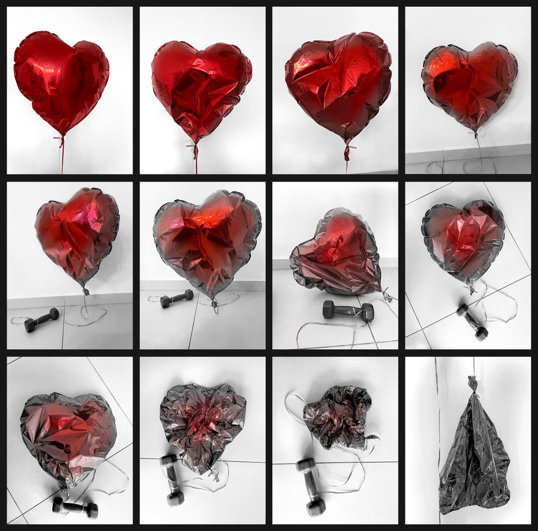The artwork "Losing Hope" consists of 12 photos. Here I explore the slow, painful process of watching hope fade. Through a series of photos, I capture the deflation of a red, heart-shaped balloon tied to a dumbbell. In start, the balloon floats freely in the air, full of life and possibility. But as time passes, it begins to go down, weighed down by the burden it is attached to. In finish the balloon deflates, collapsing weakly beside the dumbbell. This visual metaphor reflects the emotional journey of hope gradually slipping away, leaving behind a sense of exhaustion. This artwork is part of a large art project called “Fragile Beginnings” about the complexity of motherhood and the sanctity of human life.