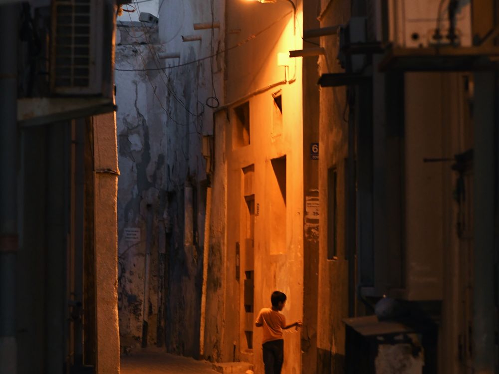 Walking through the old streets of Muharraq, a boy stands beneath a light. The surroundings grow darker as the sun sets, while he remains illuminated, standing out against the fading dusk