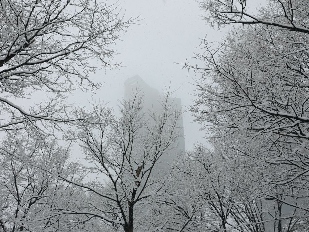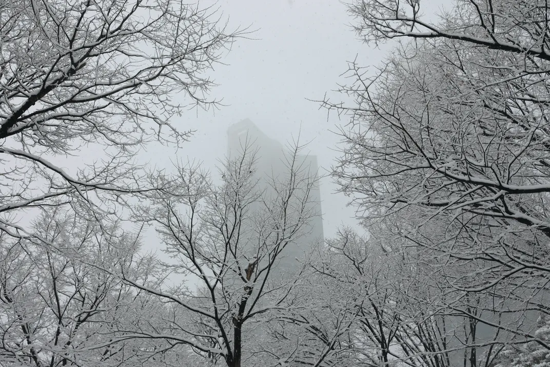 A ghostly building rises from the winter mist in Seoul, South Korea, framed by snow-laden branches, in a hauntingly dystopian vision.