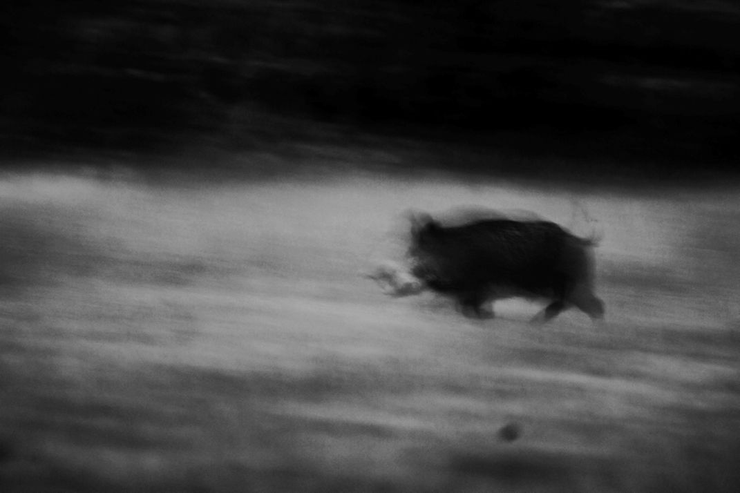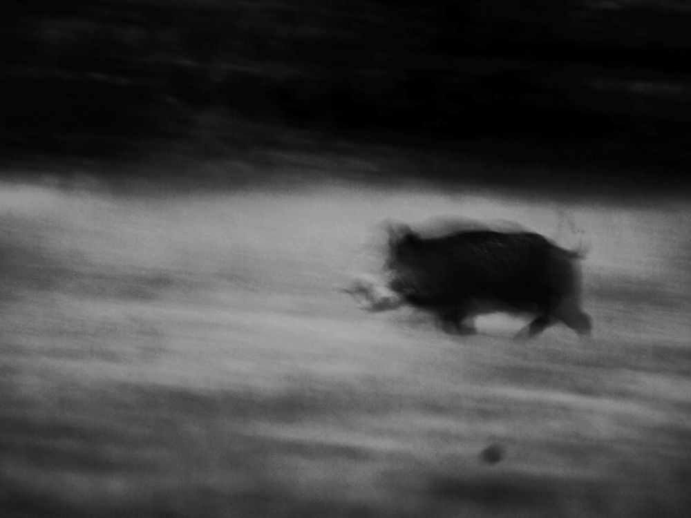 I took this photograph in November 2022 in South Of France during a very cold and misty morning. We were closed to 0°C, my hands were shaking and I was seeing almost nothing in front of me. Suddenly a wild boar run cross the field followed by seven others. It was like a ghost, I barely saw him and the atmosphere was very special. I tried to transliterate as much as I can what I felt through this pic by putting th shutter speed at 1/5 sec which created effect of cave painting.